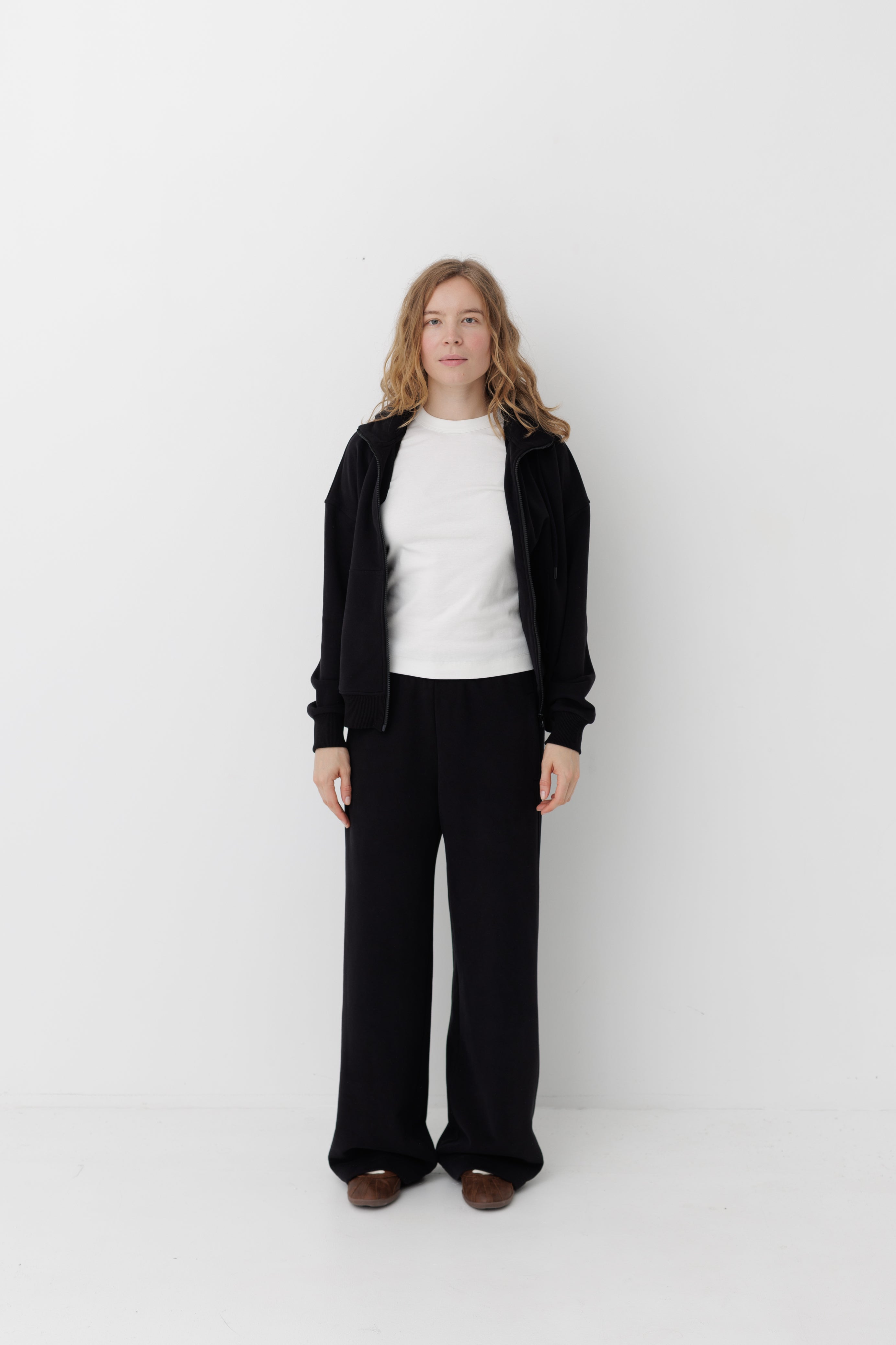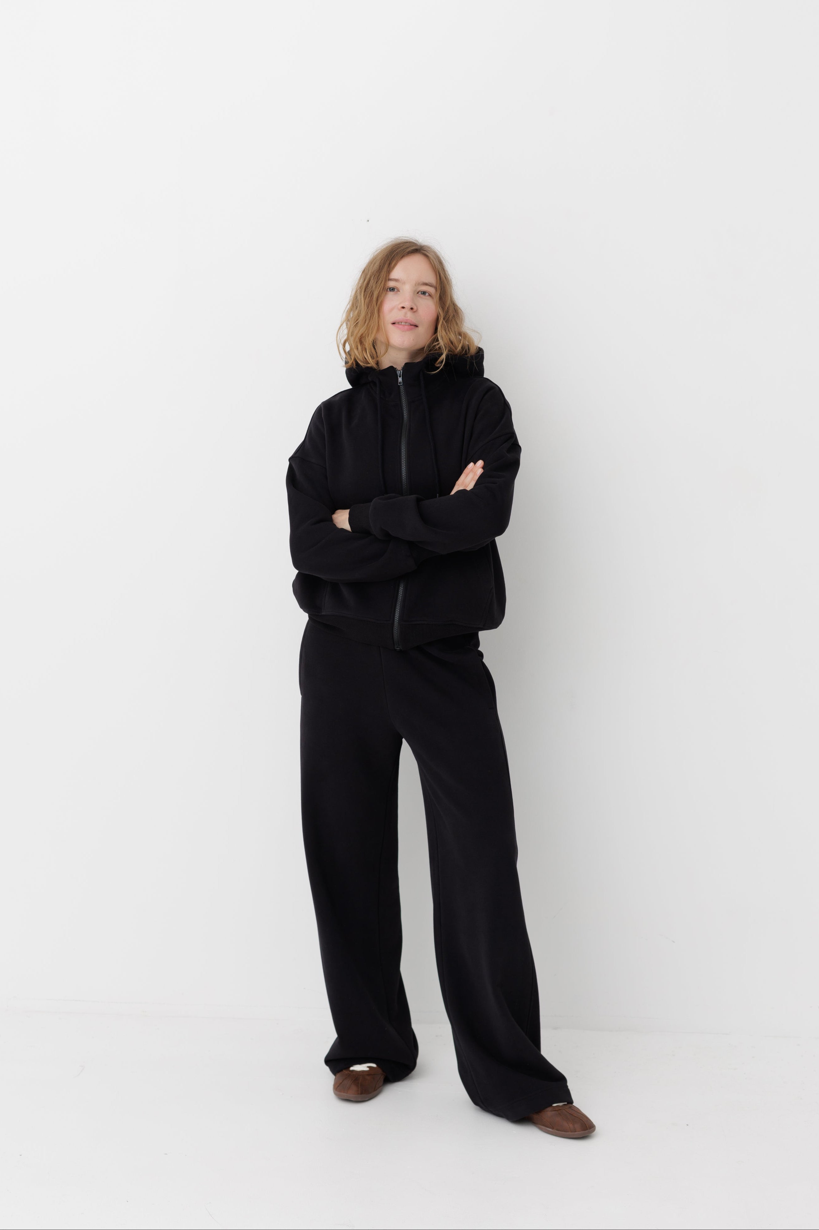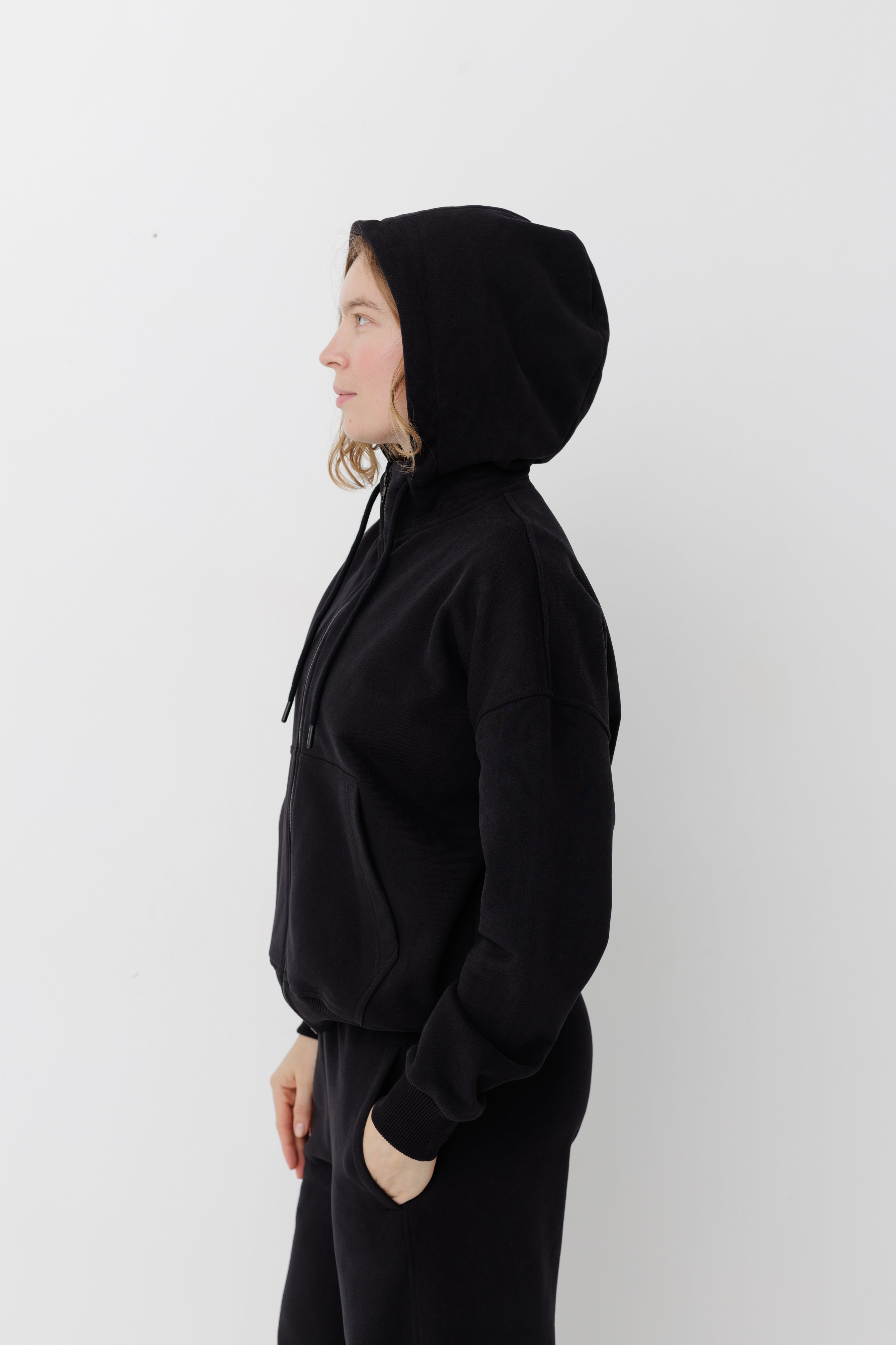 Жіноче худі на блискавці зі спущеним плечем. Має подвійний капюшон з бавовняним шнурком в тон до тканини та невеликою стійкою-коміром.