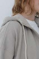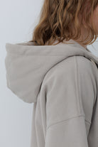 Жіноче худі на блискавці зі спущеним плечем. Має подвійний капюшон з бавовняним шнурком в тон до тканини та невеликою стійкою-коміром.
