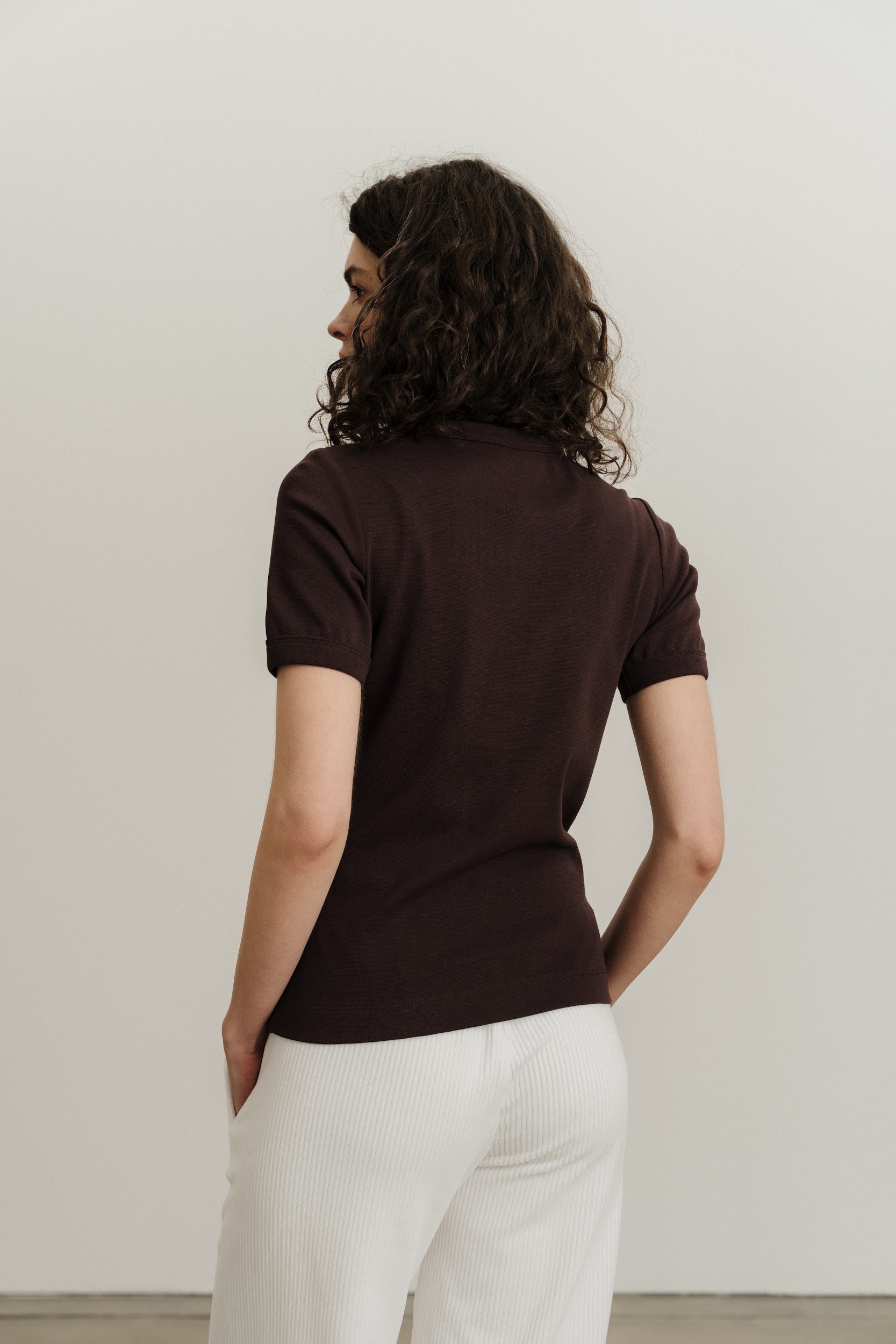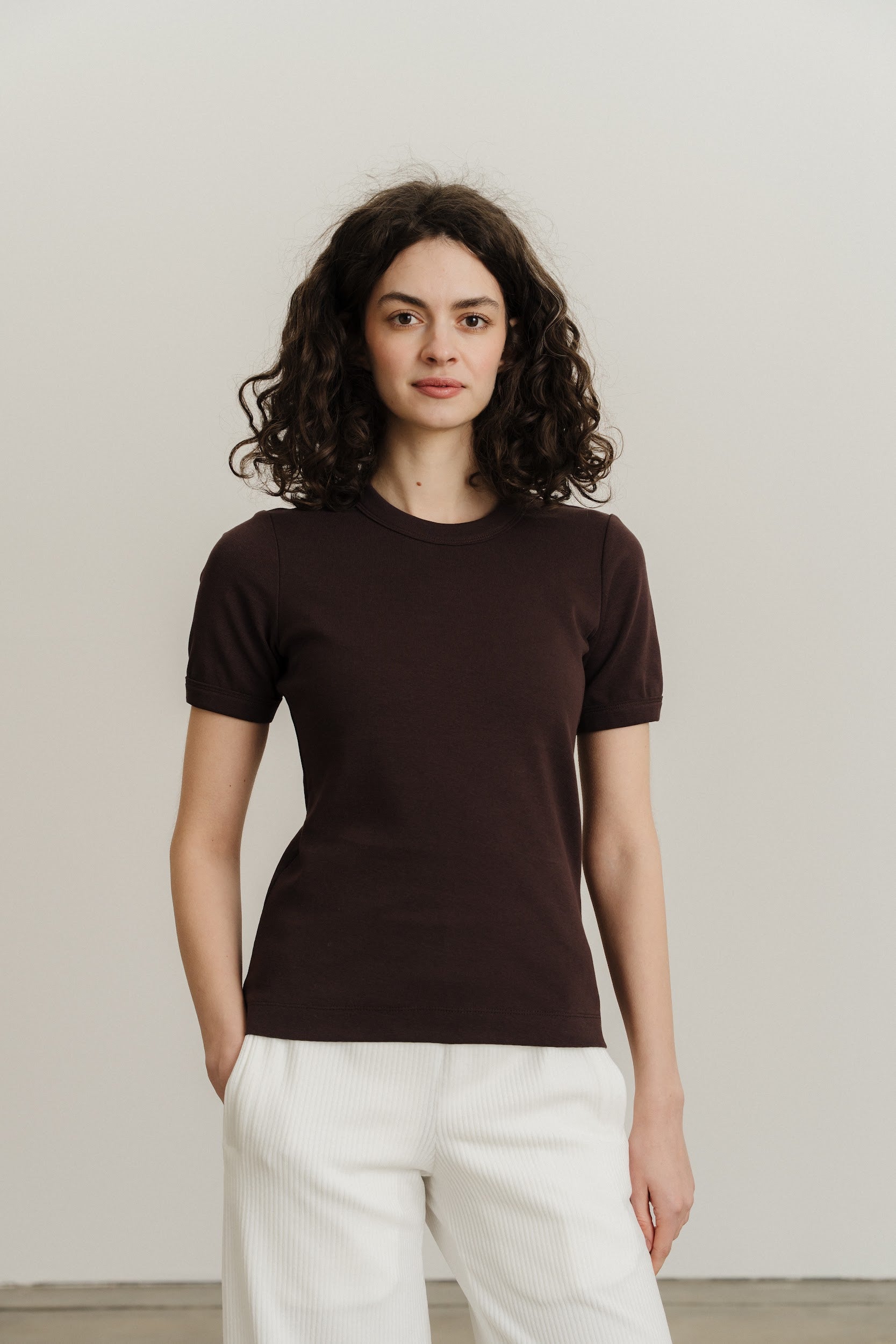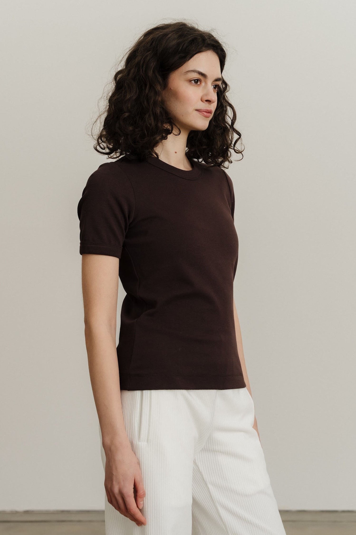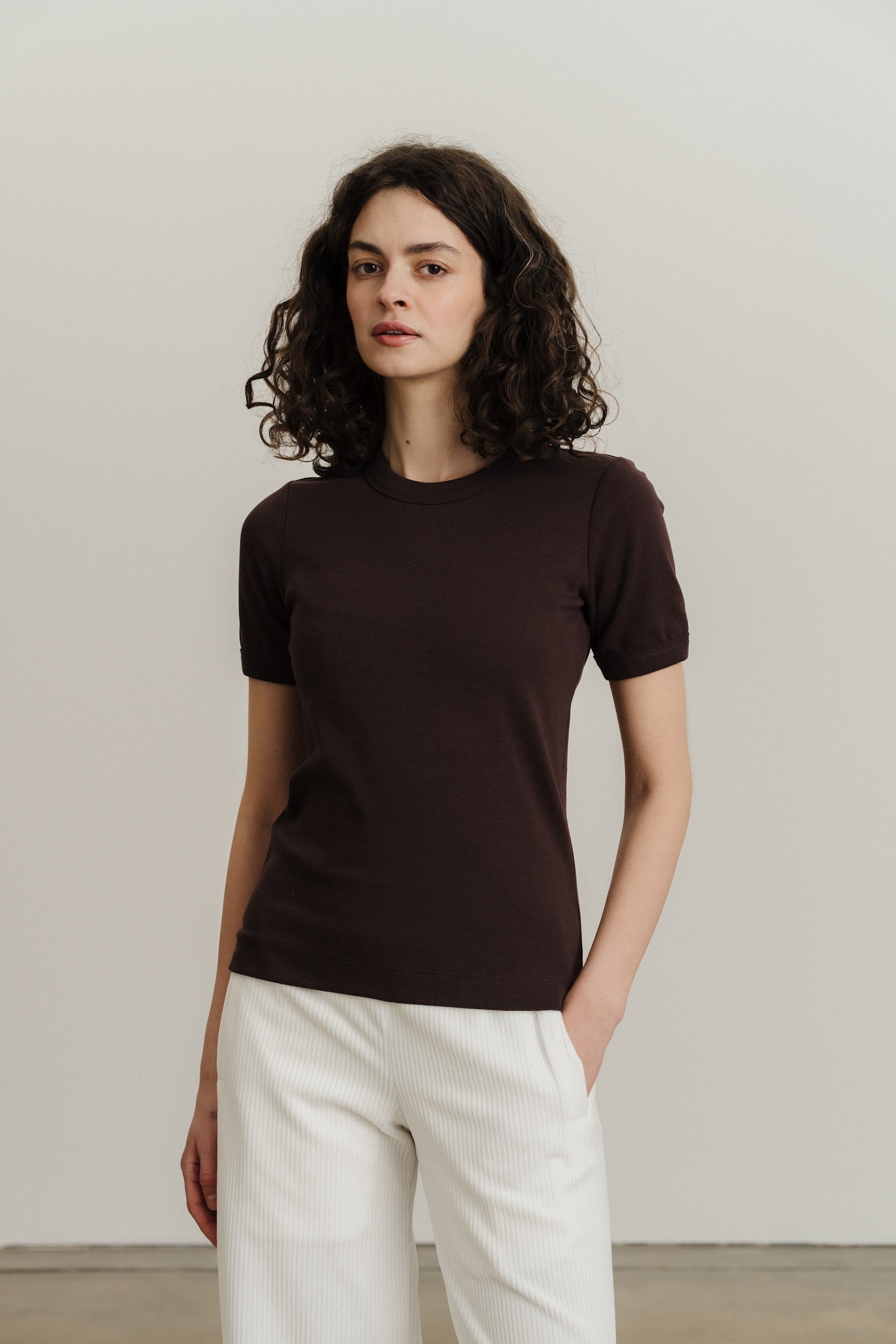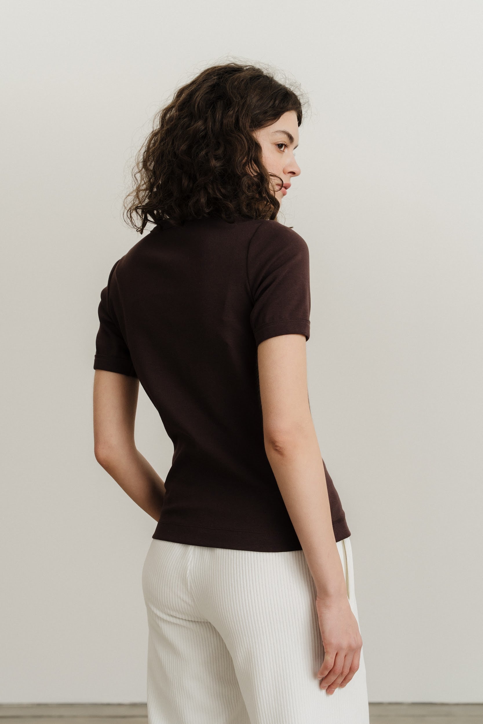 Трикотажна футболка стандартного крою виконана з еластичного матеріалу в рубчик. Круглий виріз горловини та короткі рукави, оздоблені окантовкою в тон. Посадка футболки по фігурі.