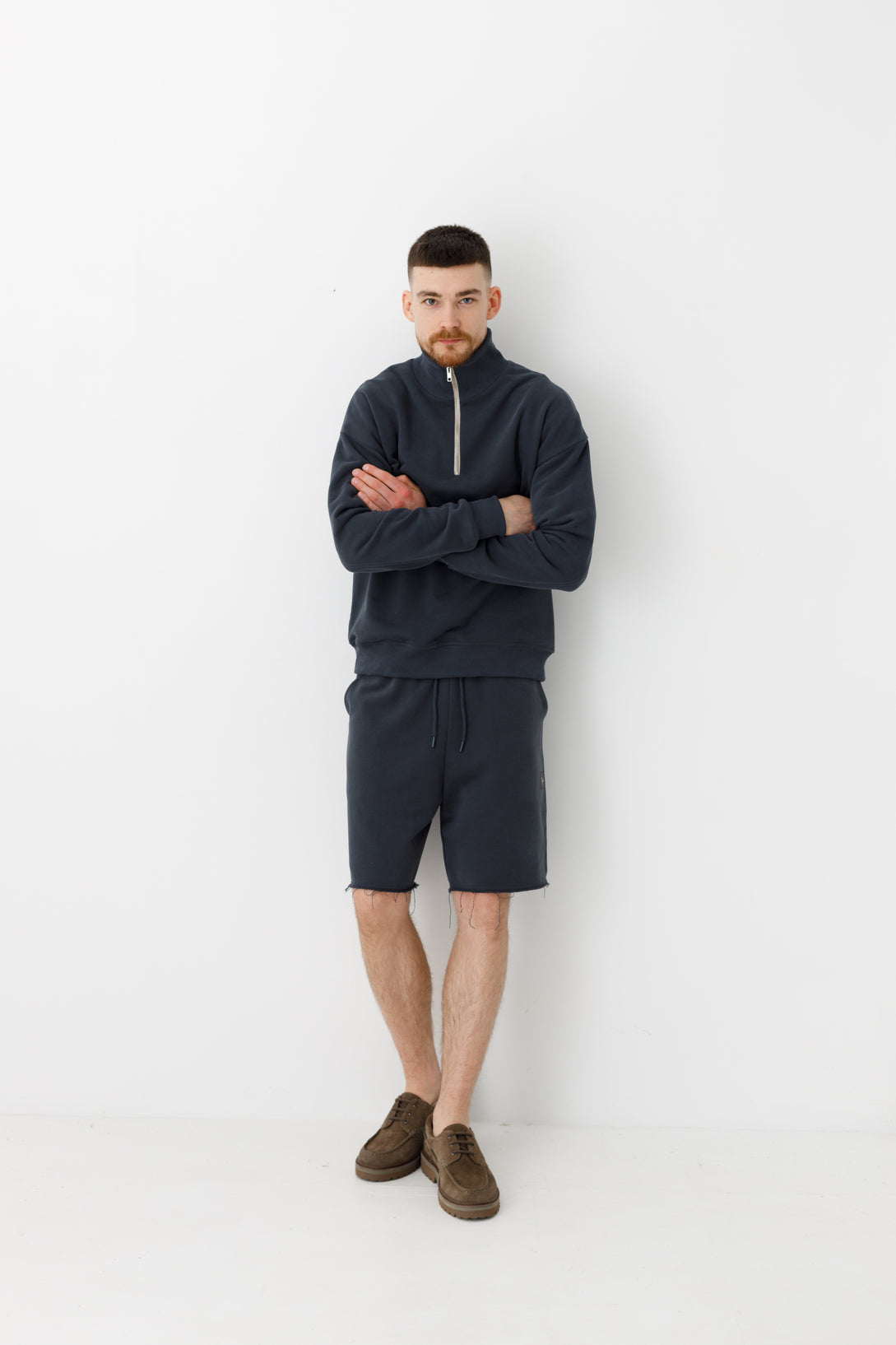 Широкі шорти вільної та глибокої посадки. Мають довжину до колін та відкритий зріз штанин, що оздоблений фактурною відстрочкою.