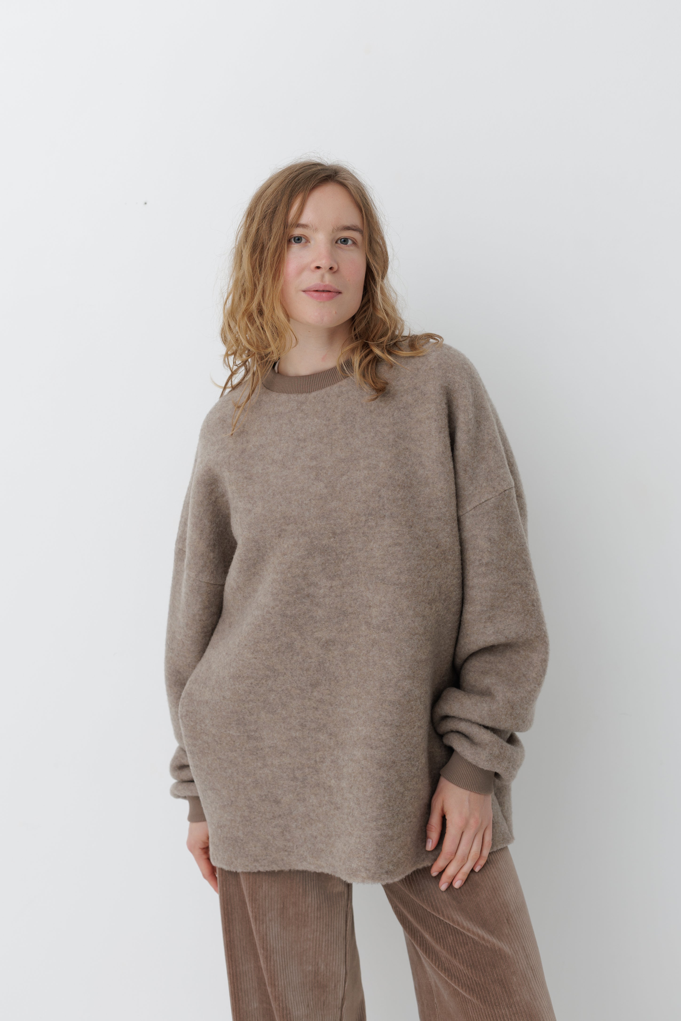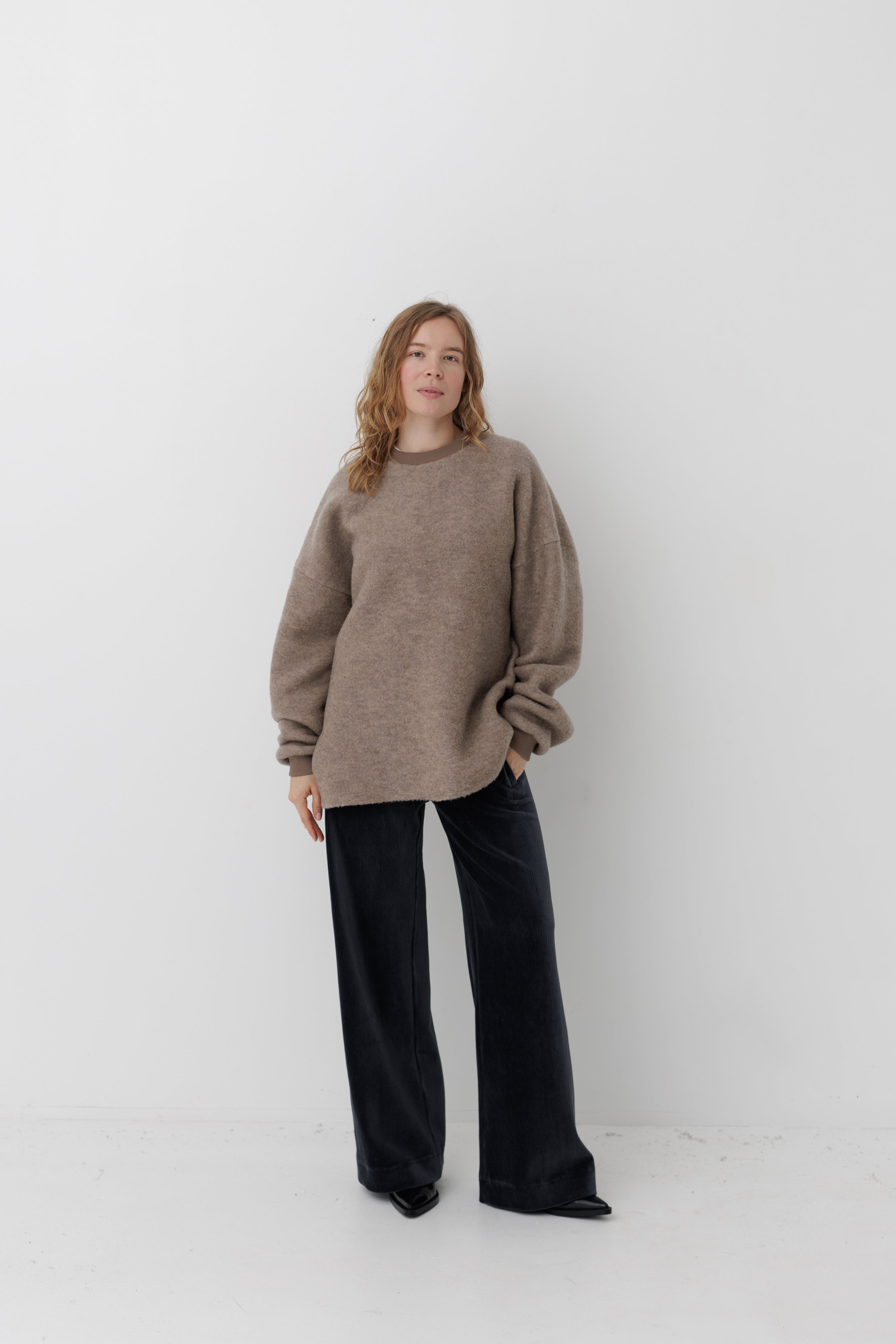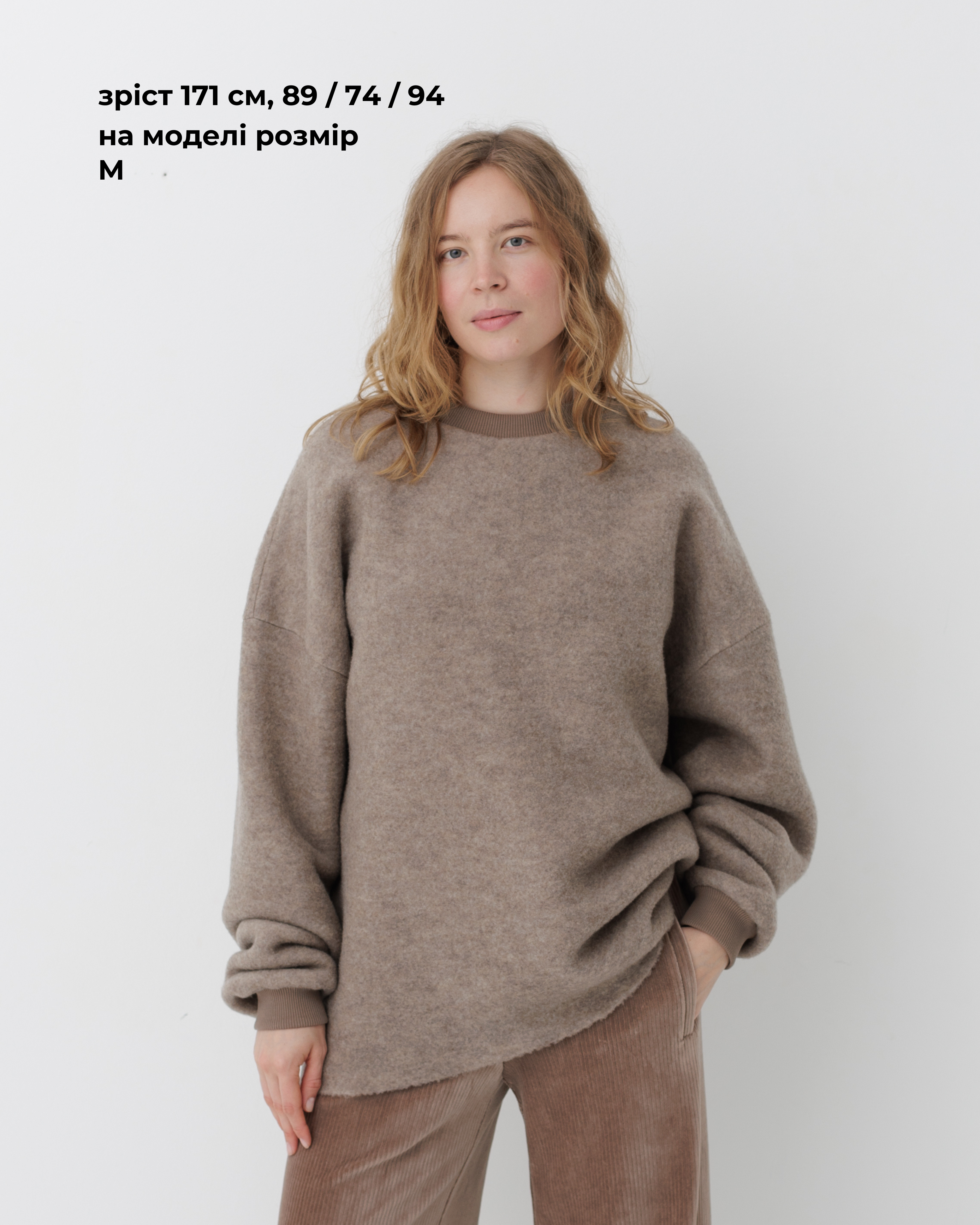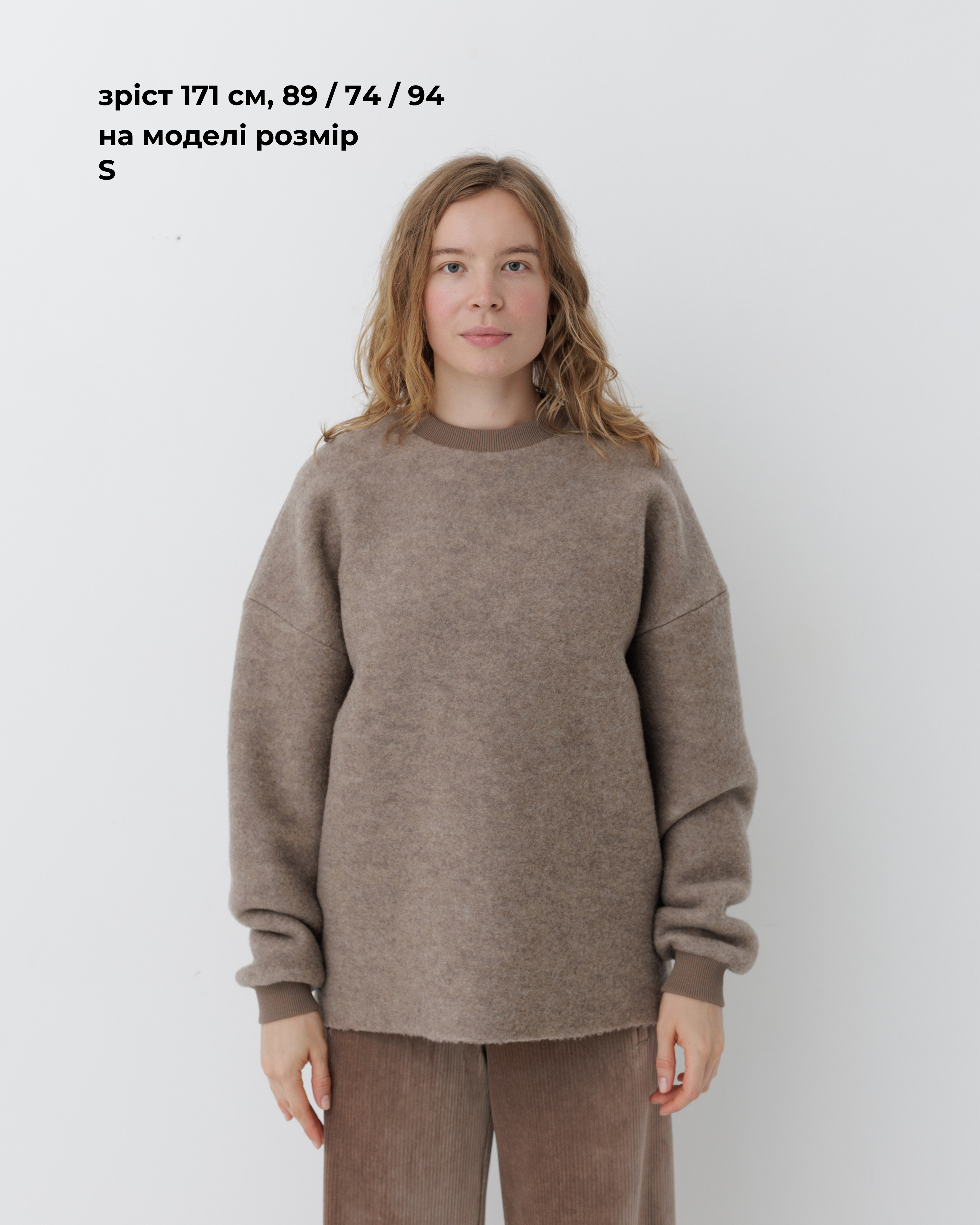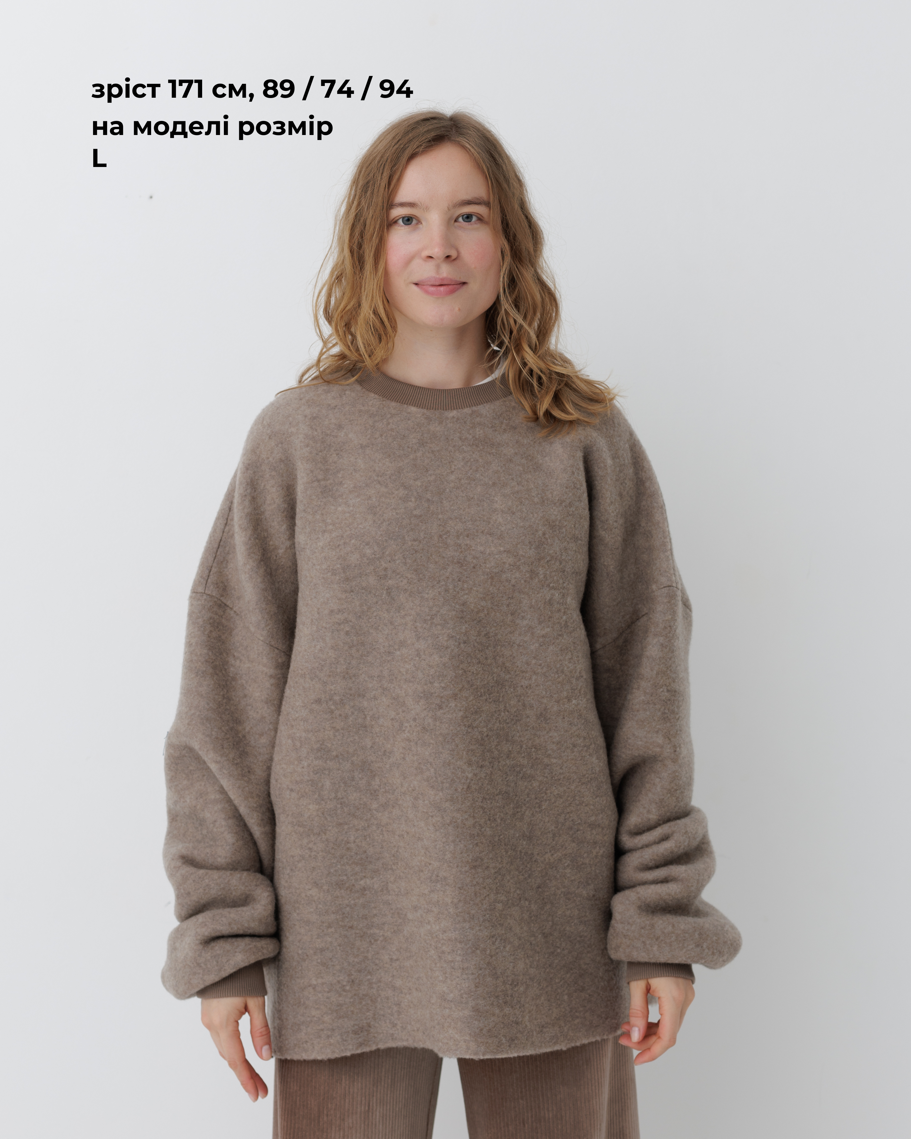 Вовняний светр формату унісекс. Виготовлений з преміальної тканини, у складі якої 84% вовни та 16% нейлону. Об'ємна та вільна посадка зі спущеним плечем.