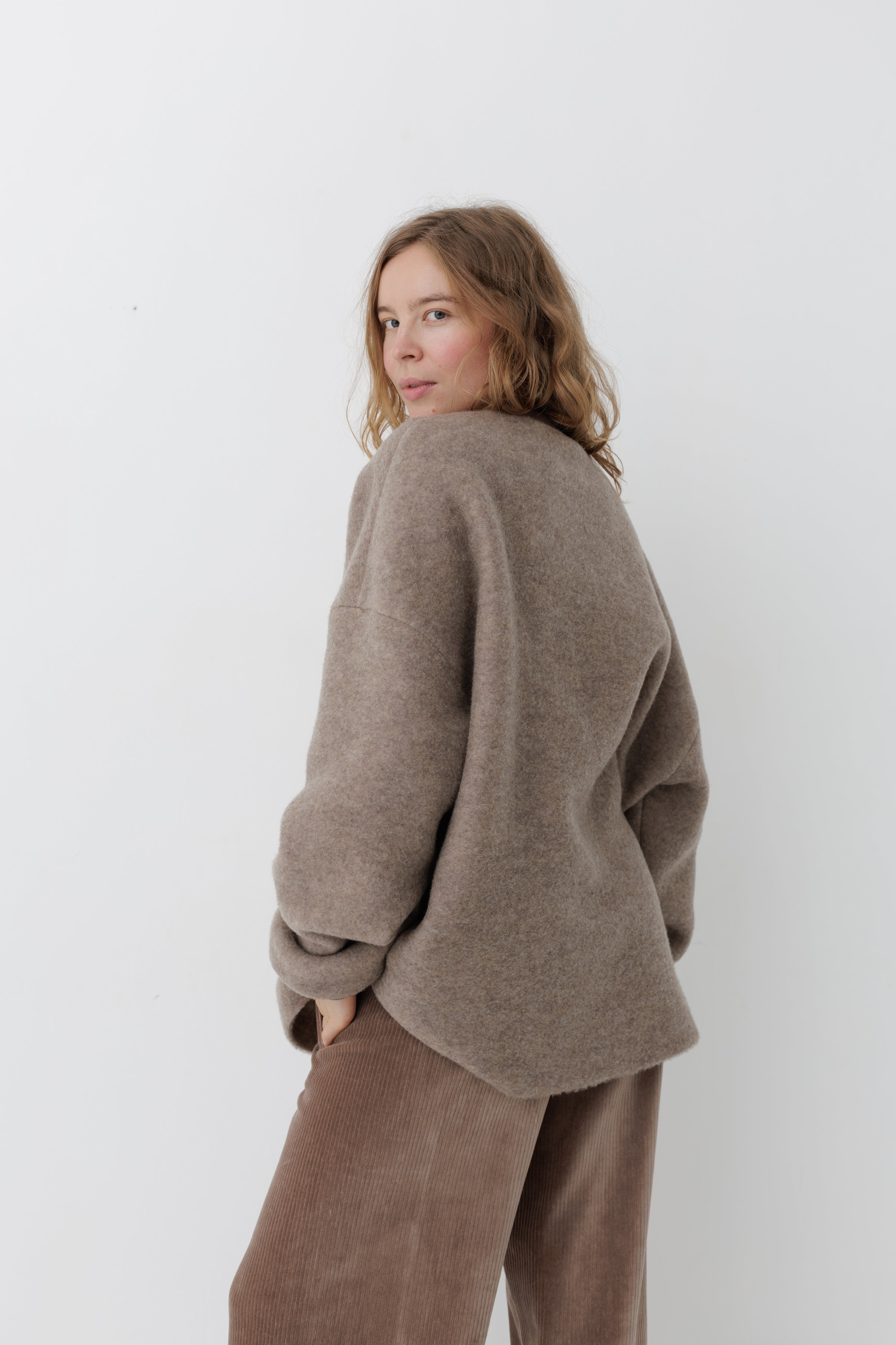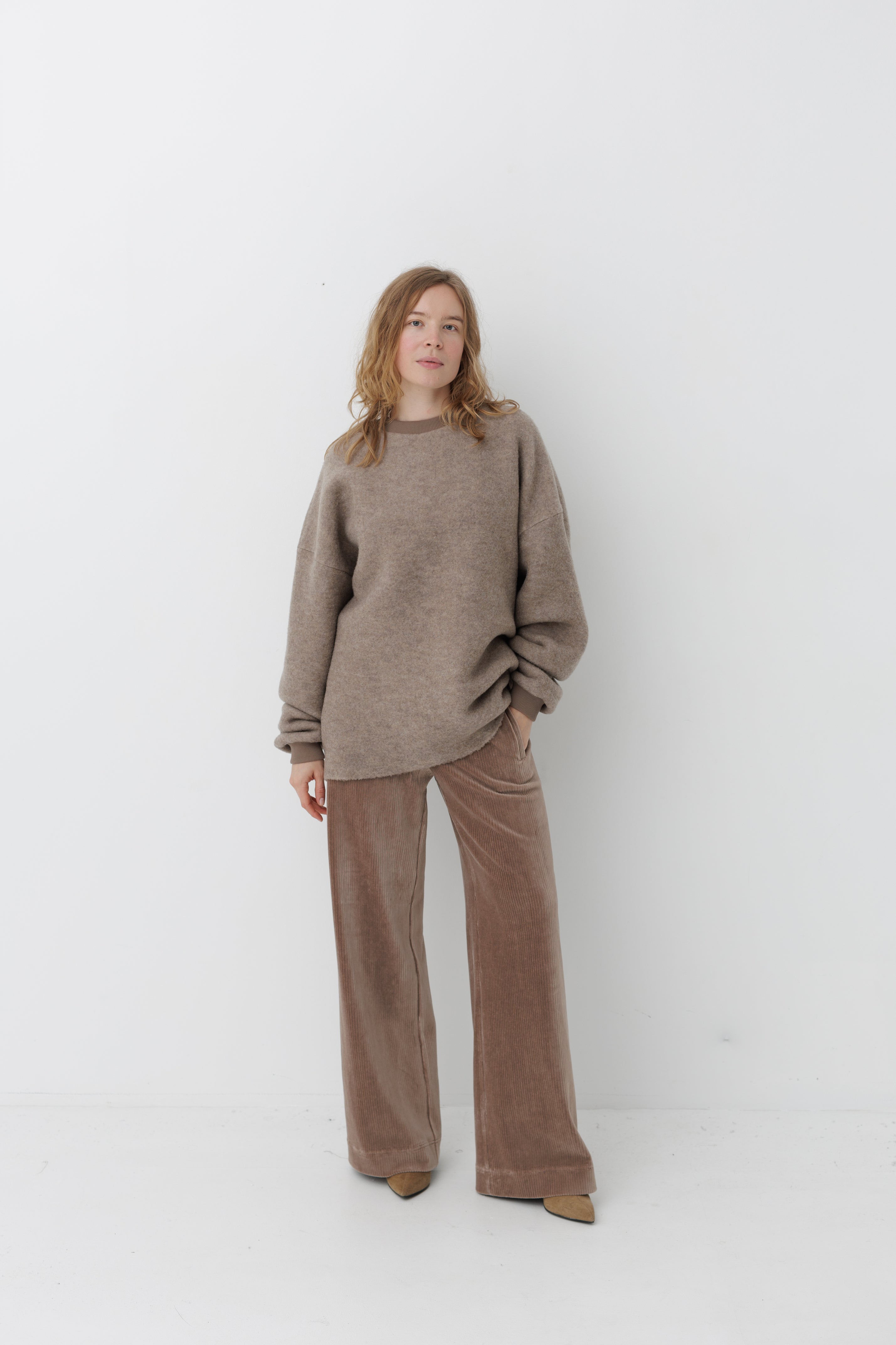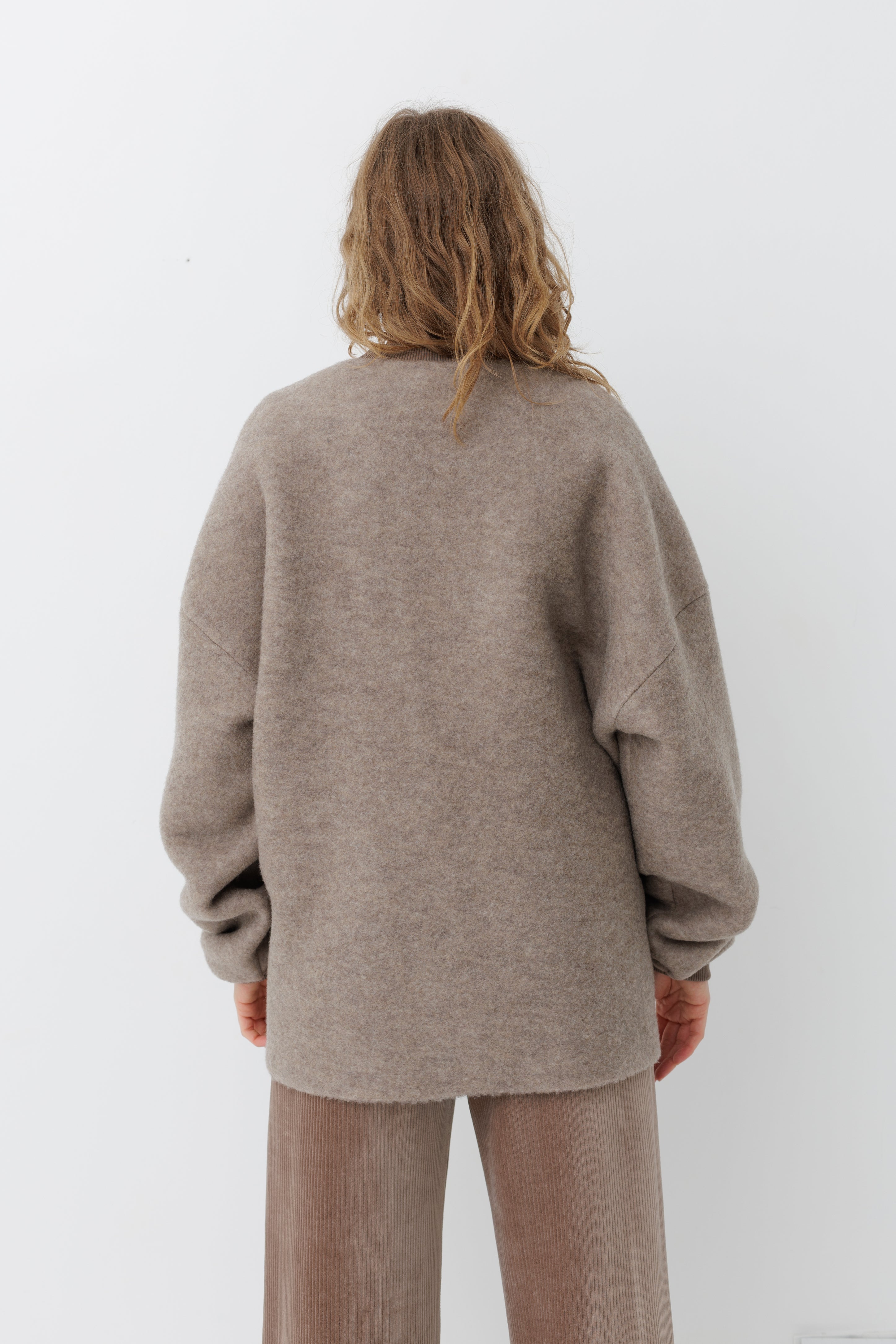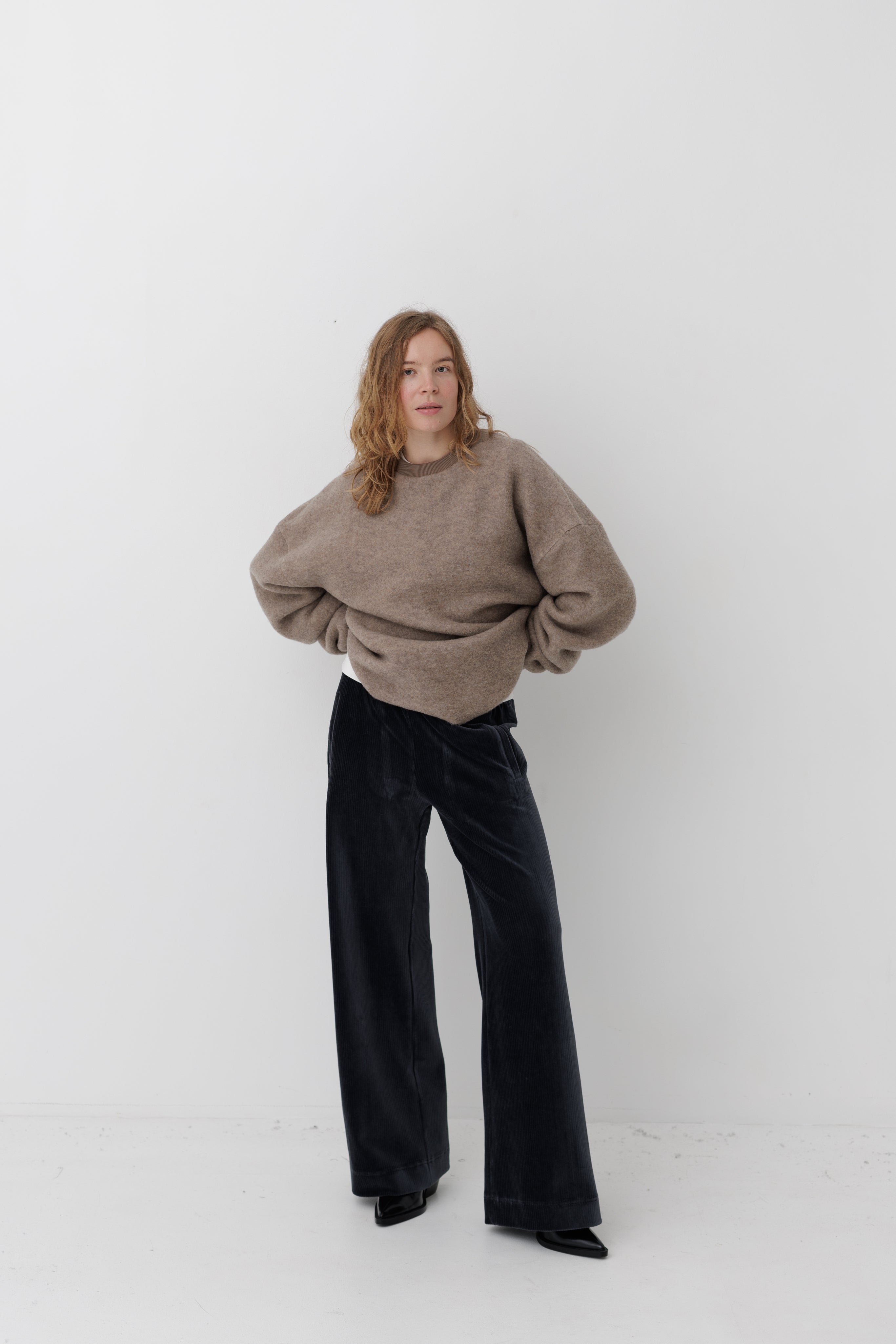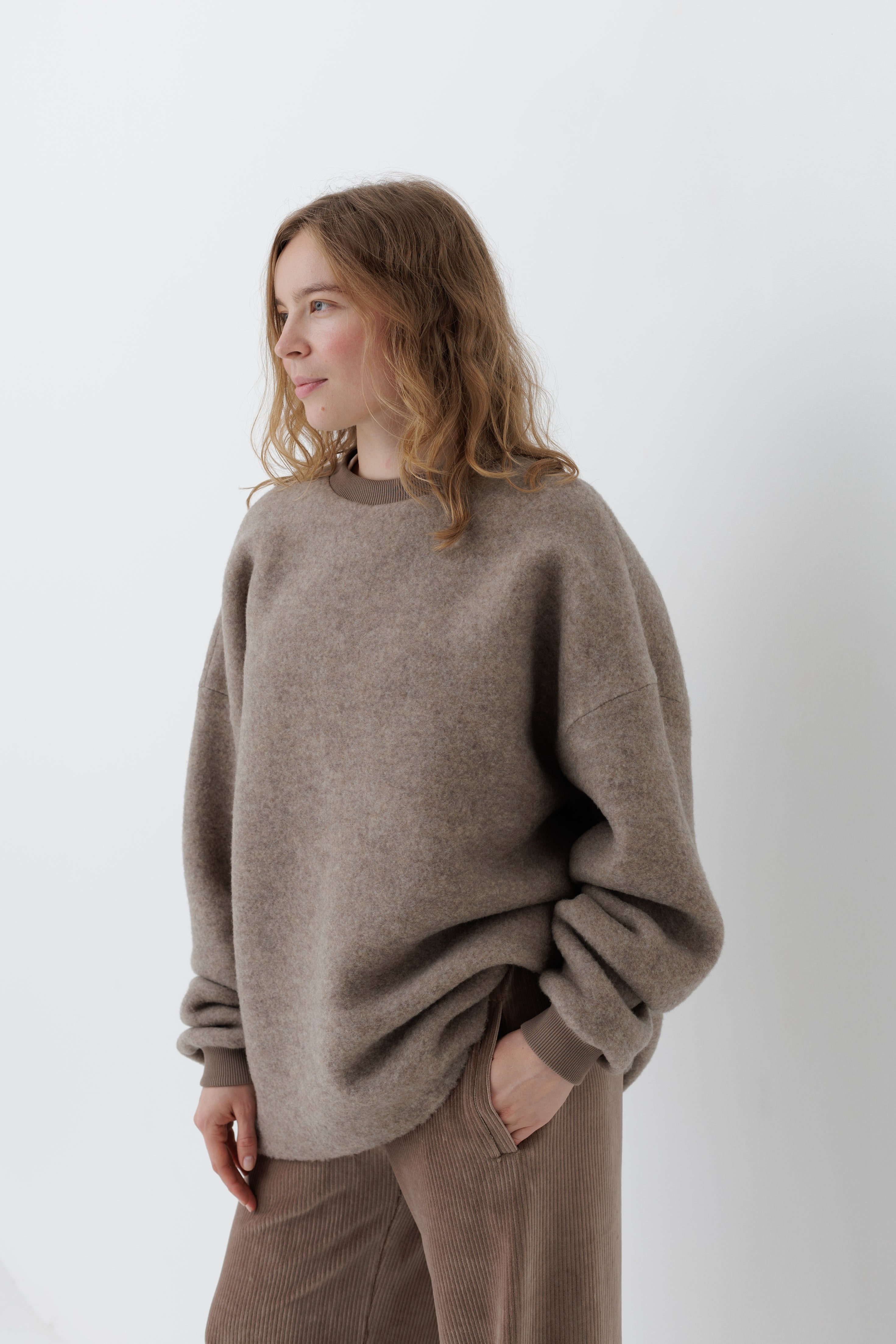 Вовняний светр формату унісекс. Виготовлений з преміальної тканини, у складі якої 84% вовни та 16% нейлону. Об'ємна та вільна посадка зі спущеним плечем.