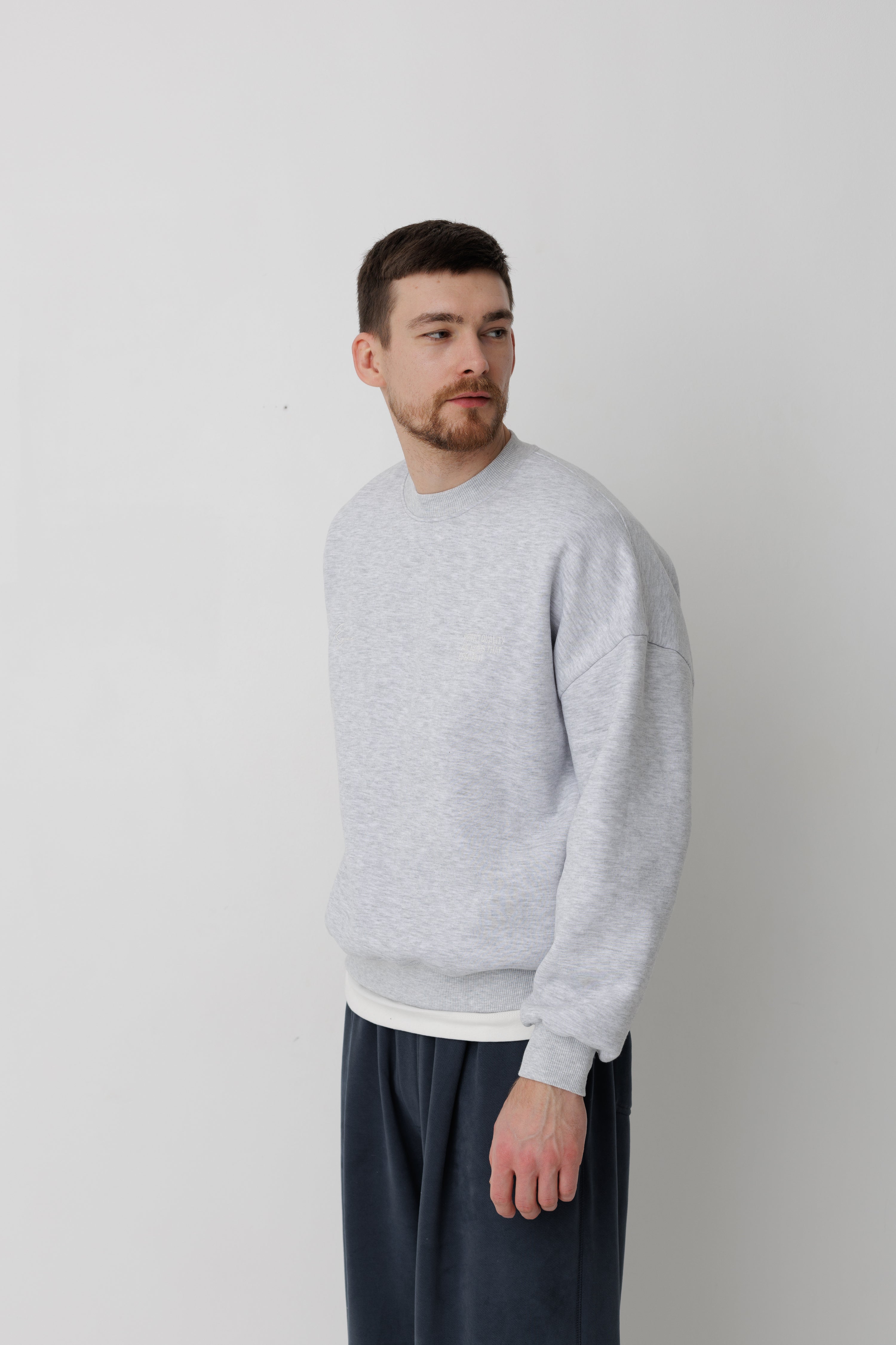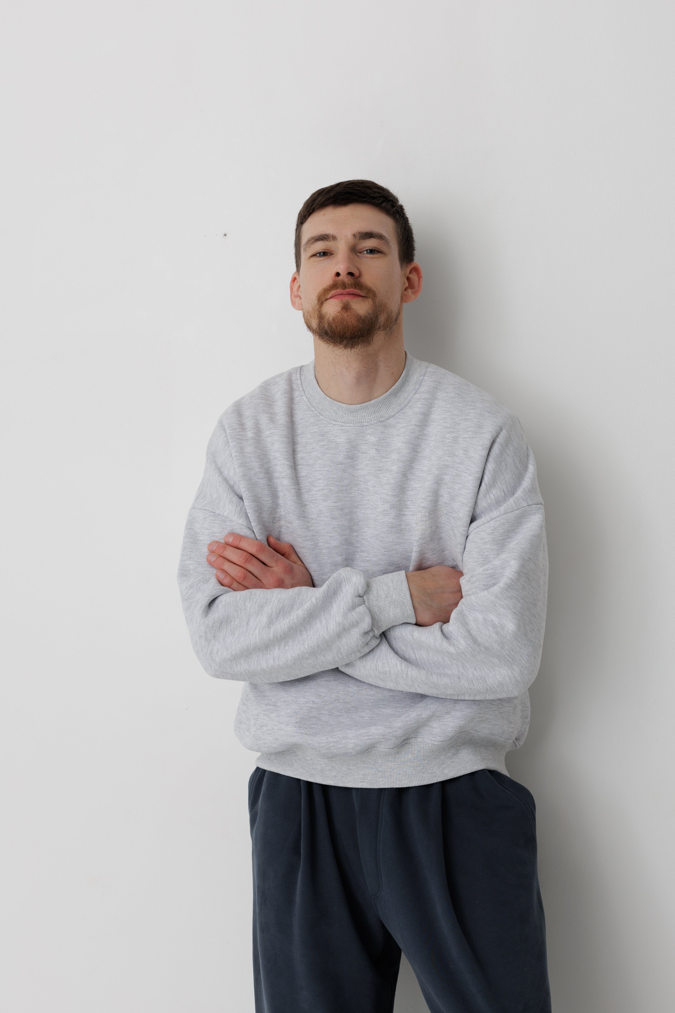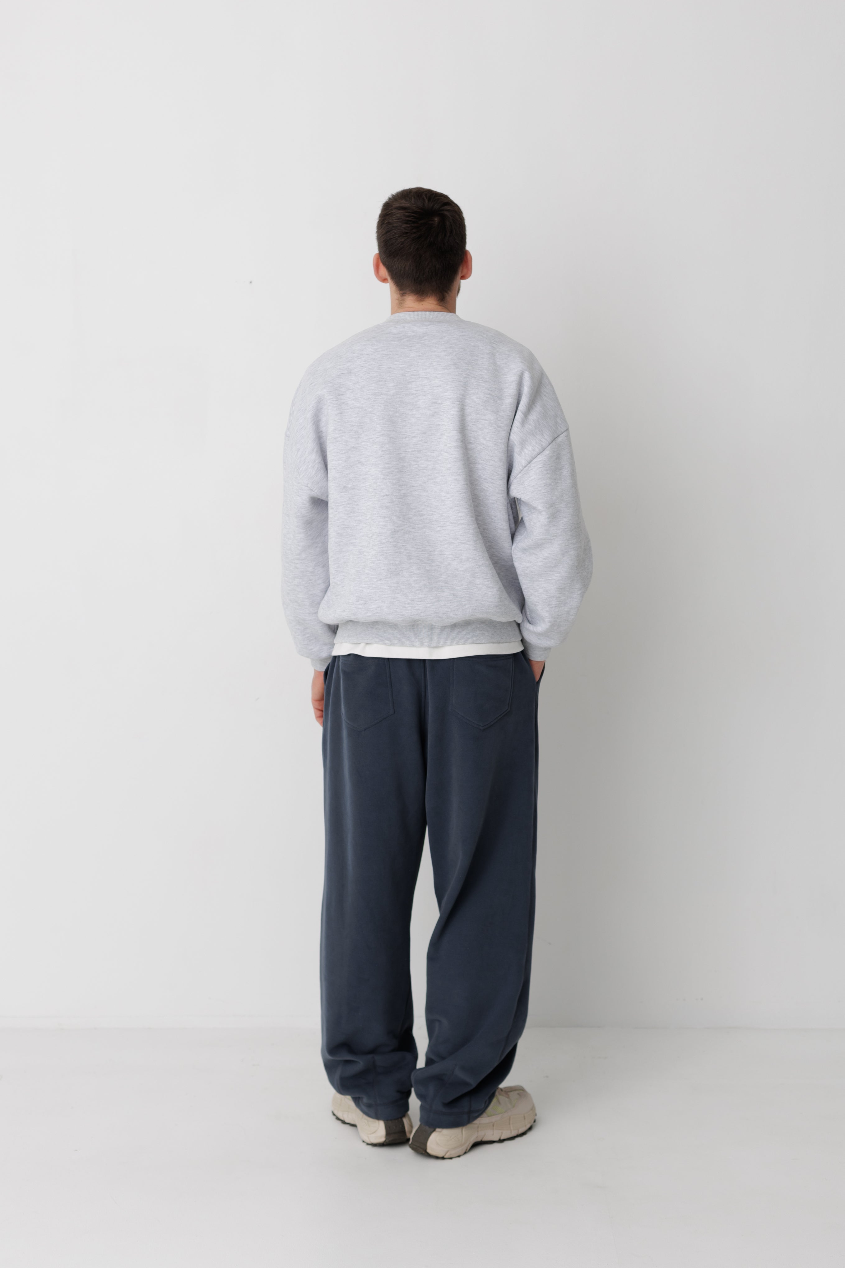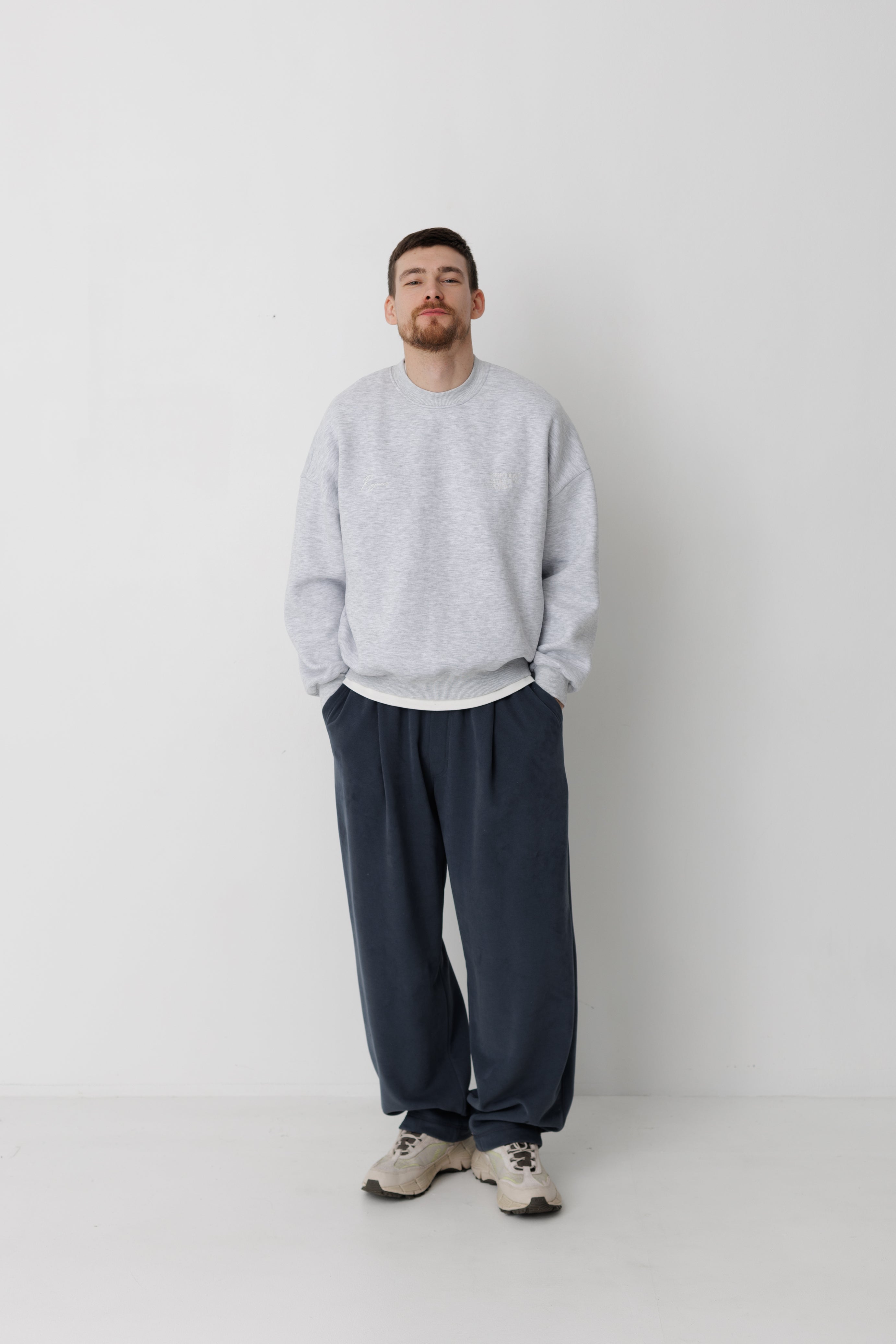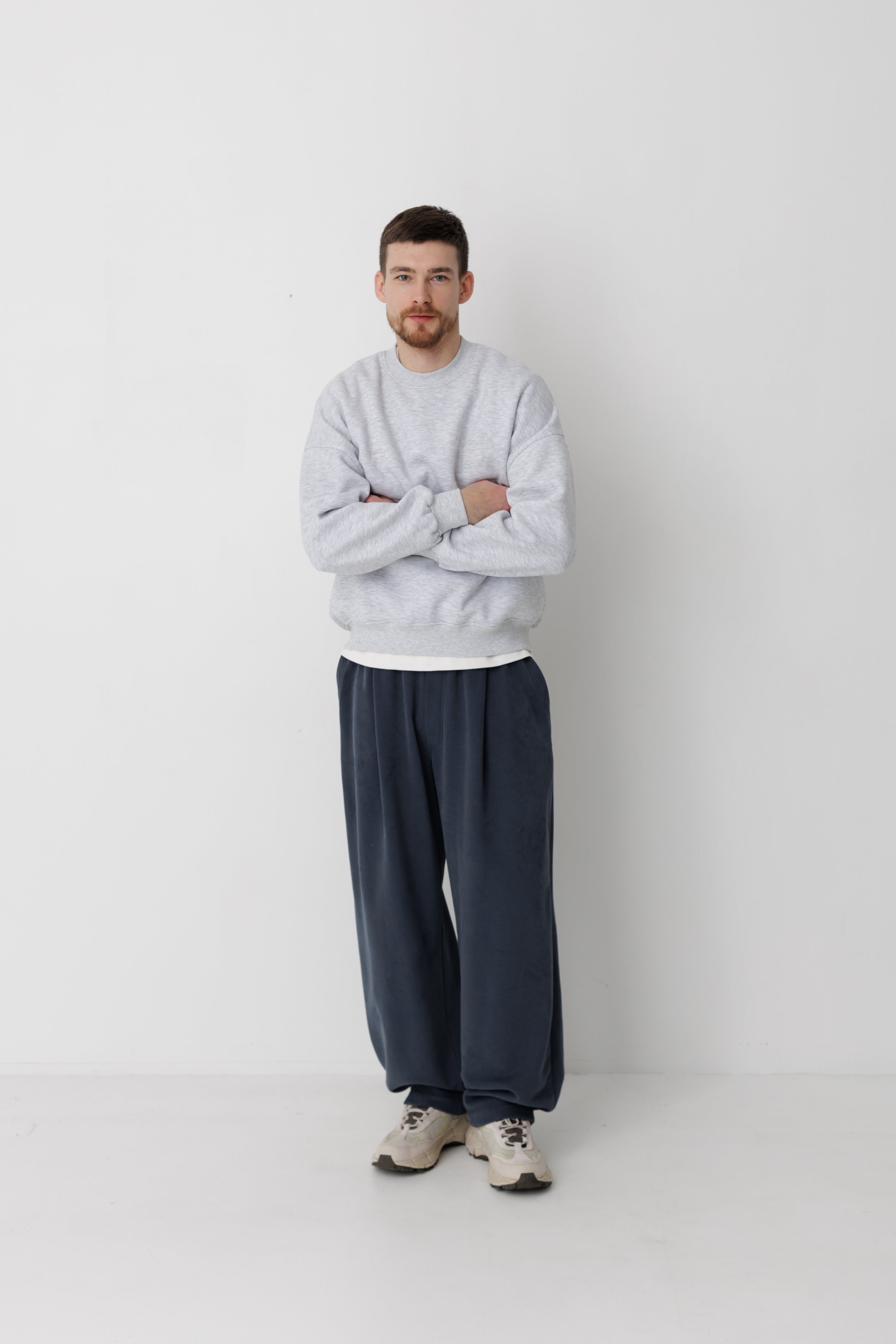 Базовий предмет гардеробу в теплому та зручному виконанні. На фото світшот в поєднанні зі штанами Беггі, графіт