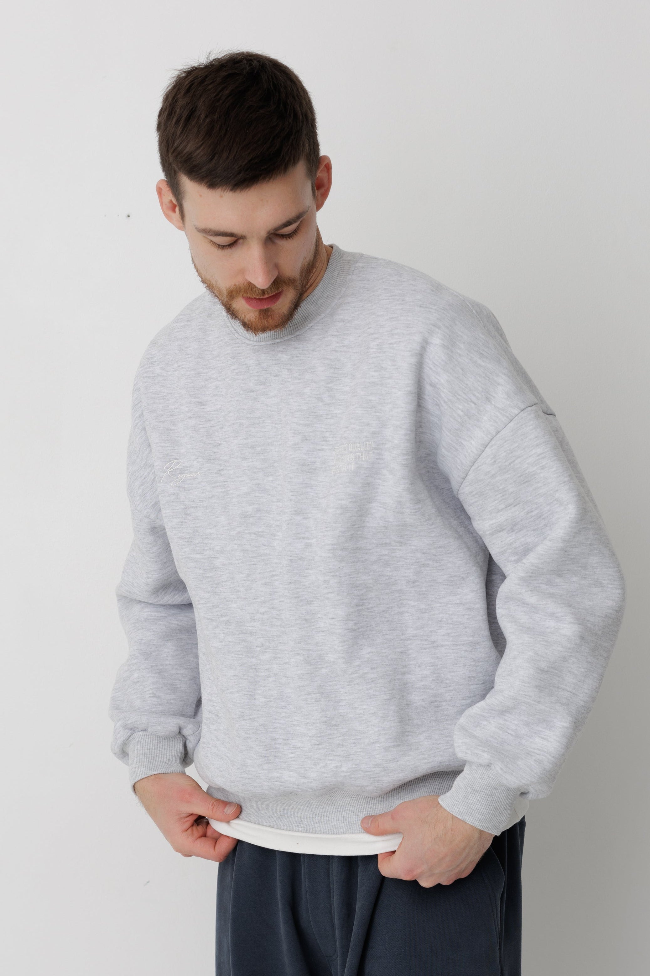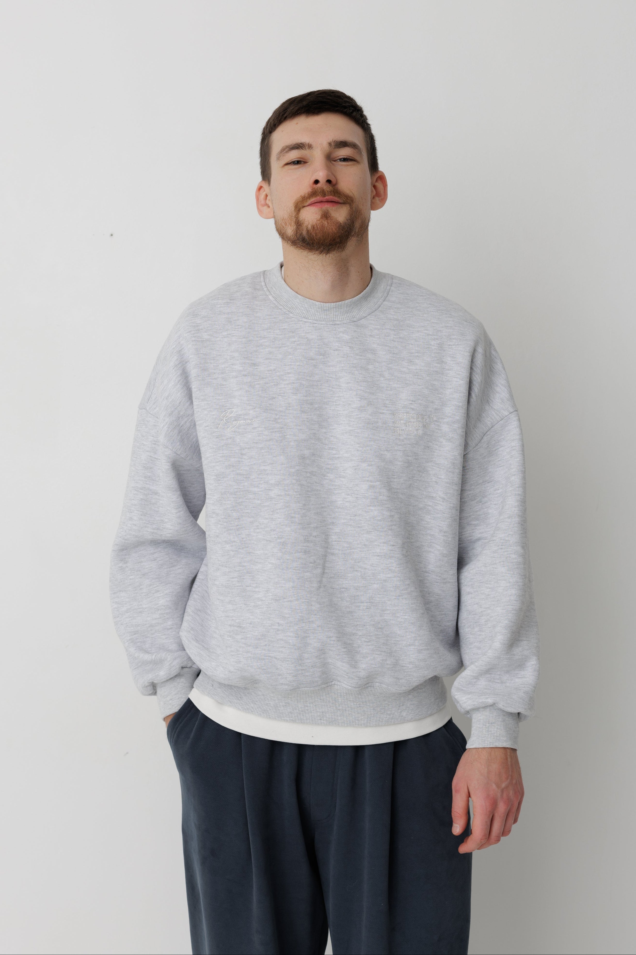 Світшот має вишитий логотип Rozmova та вишитий надпис на грудях "RESPECT QUALITY AND HANDS THAT CREAT IT"