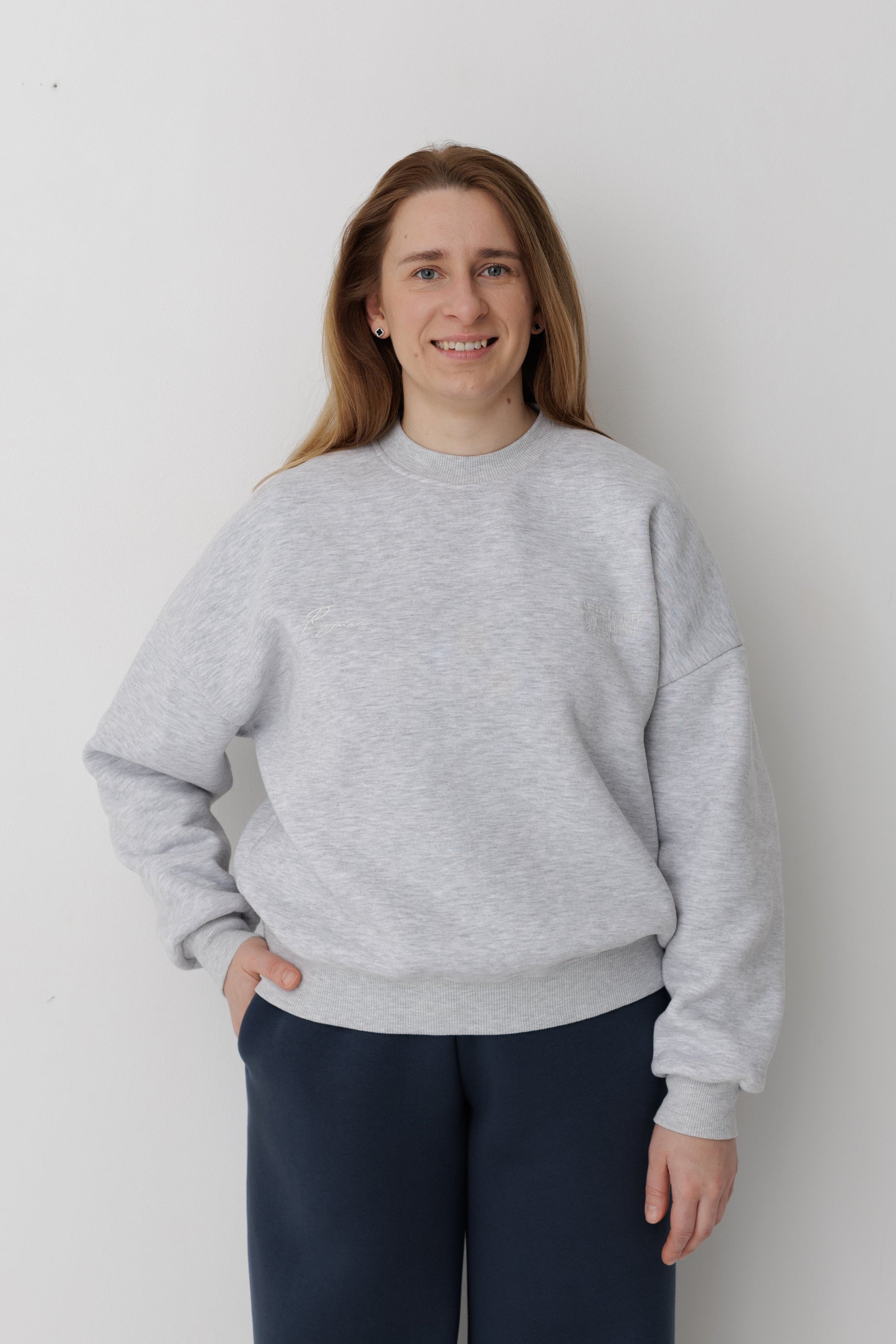Світшот має вишитий логотип Rozmova та вишитий надпис на грудях "RESPECT QUALITY AND HANDS THAT CREAT IT"