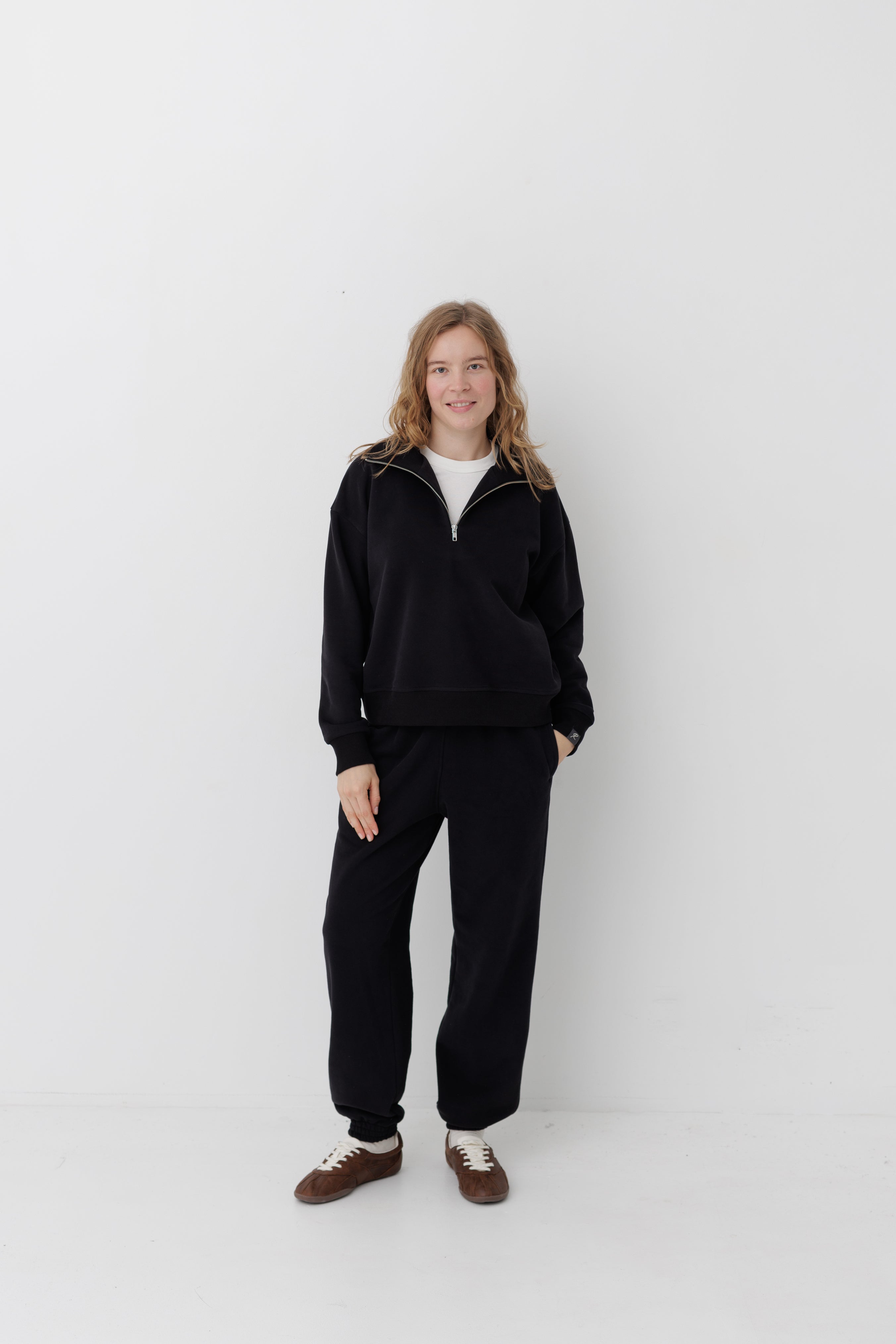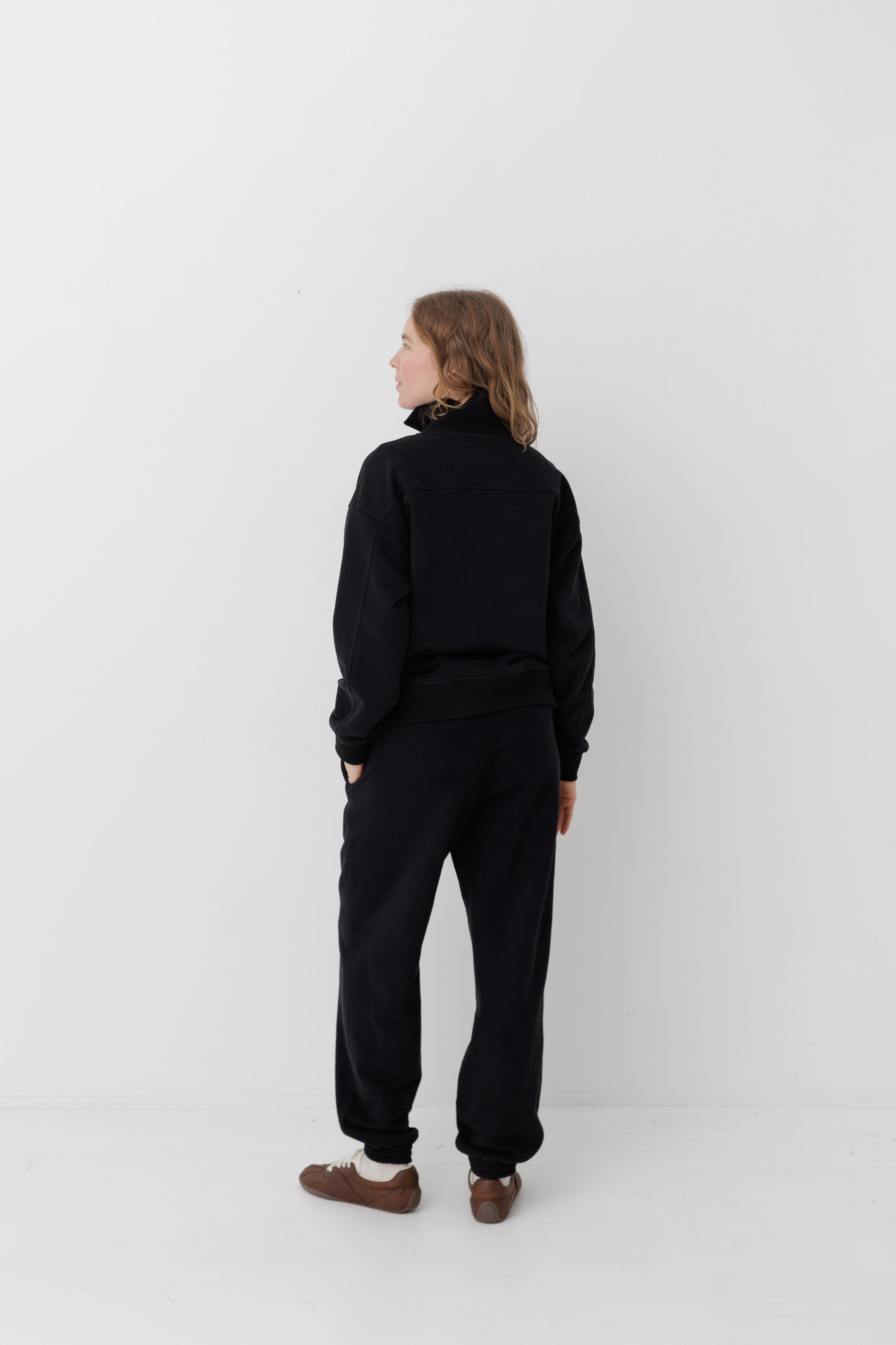 Світшот має вільну посадку, спущену лінію плеча та довжину до стегон. Комір, манжети та планка виконані з еластичного рубчику.