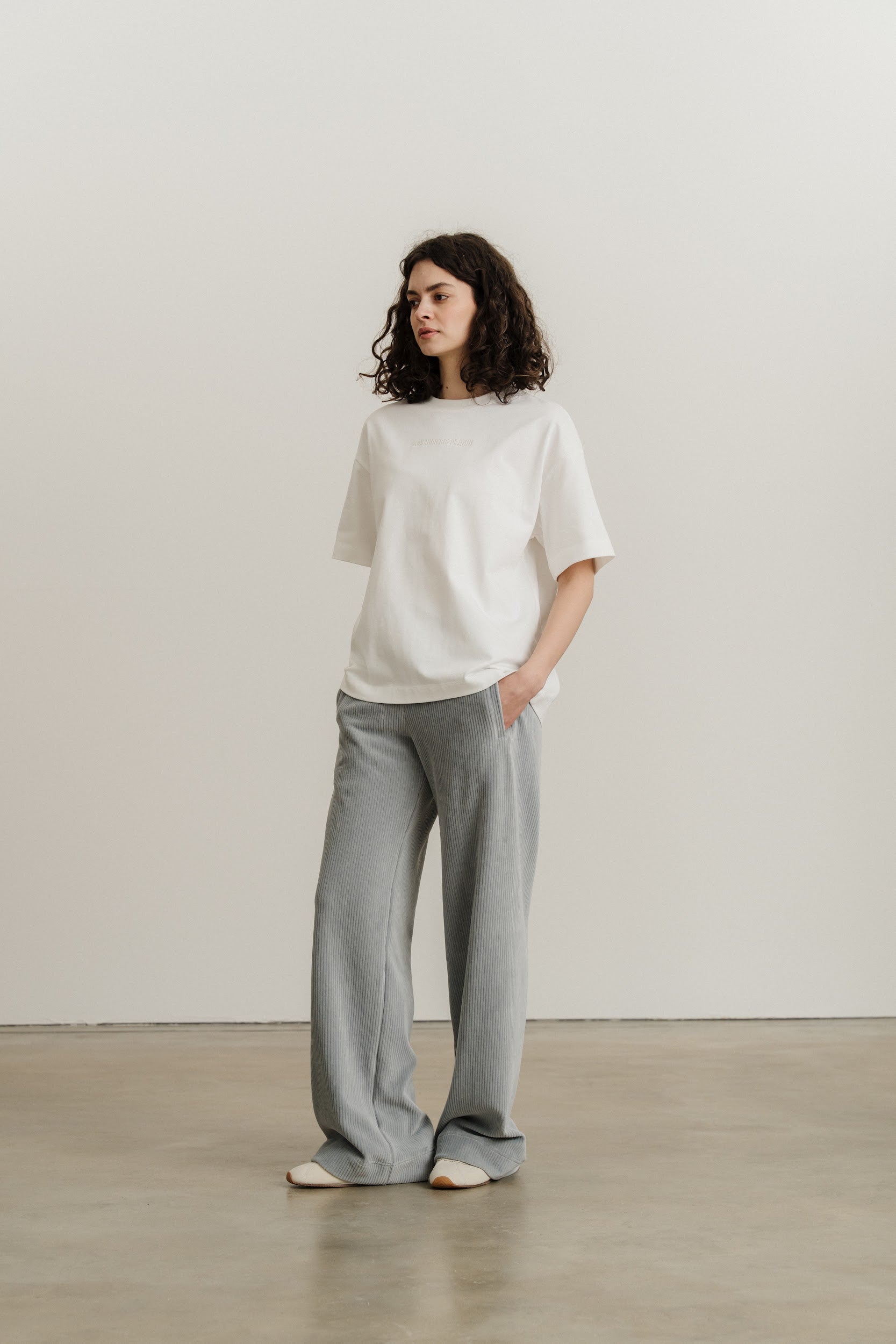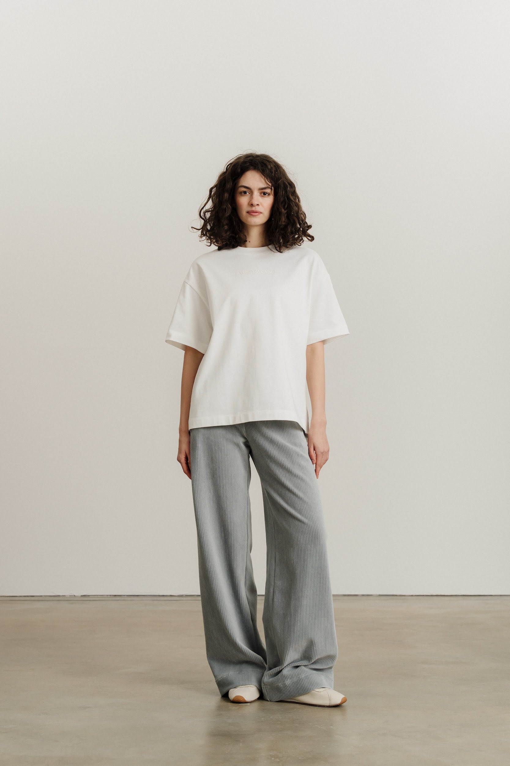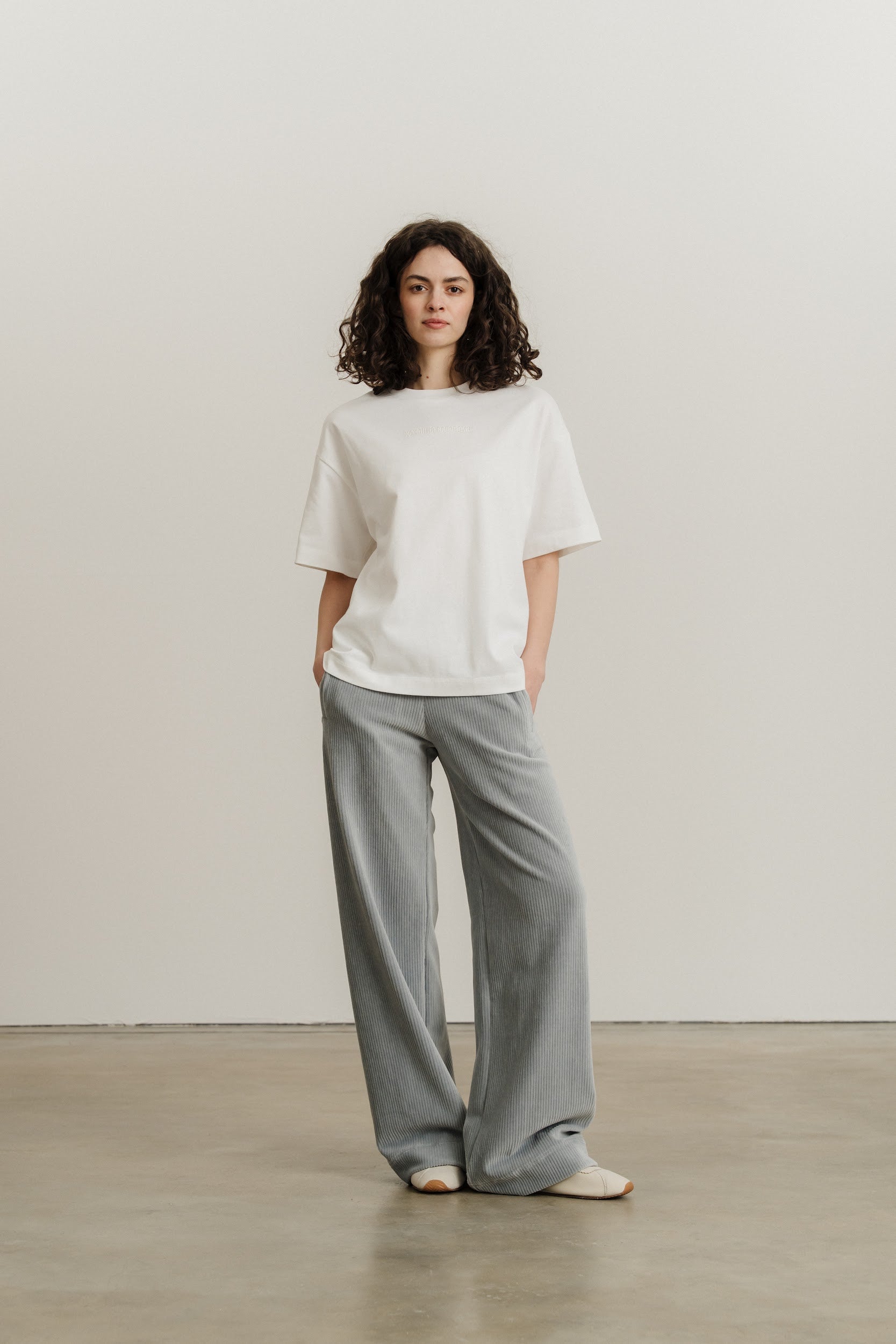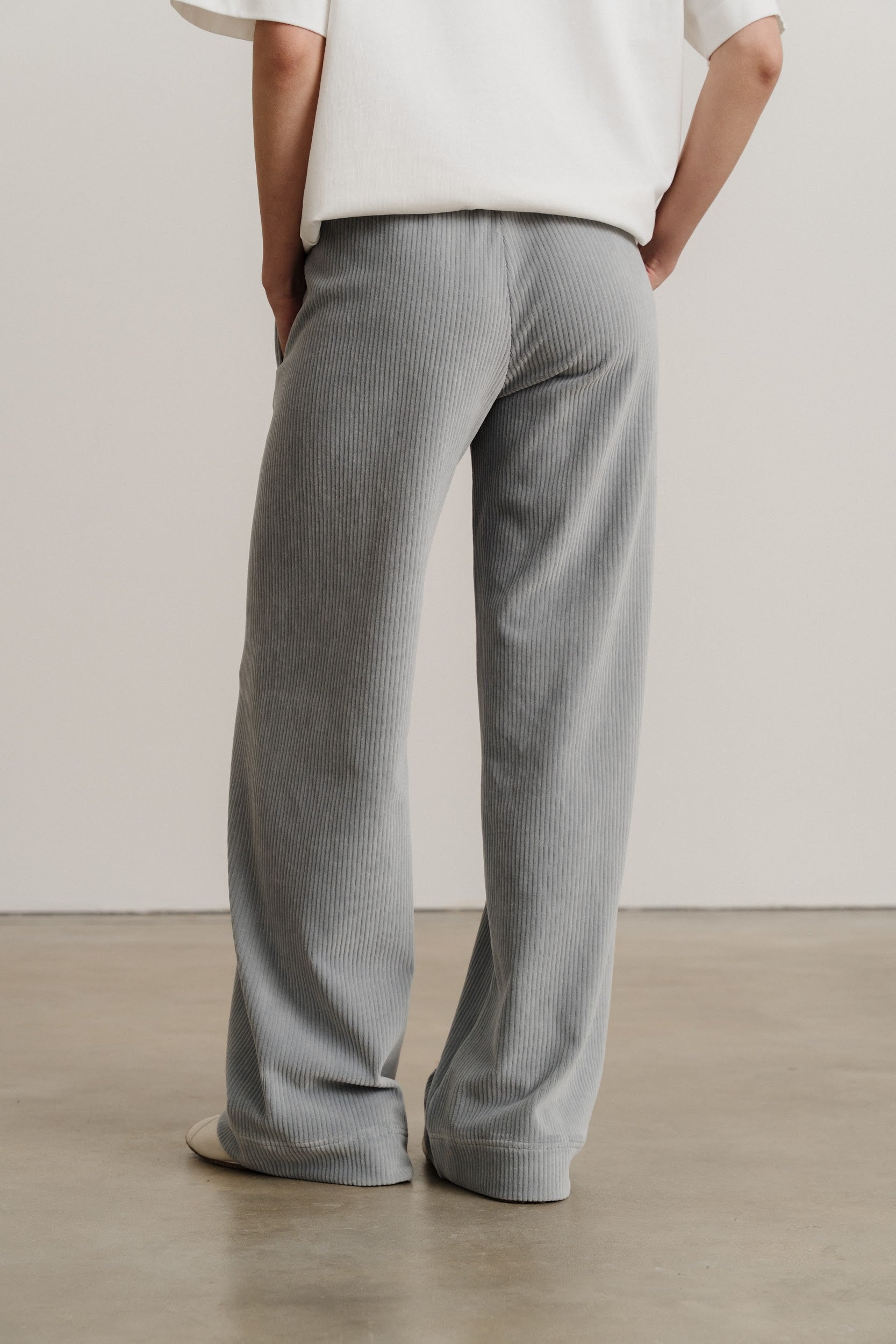 Широкі вільні прямі штани виконані із трикотажного вельвету.