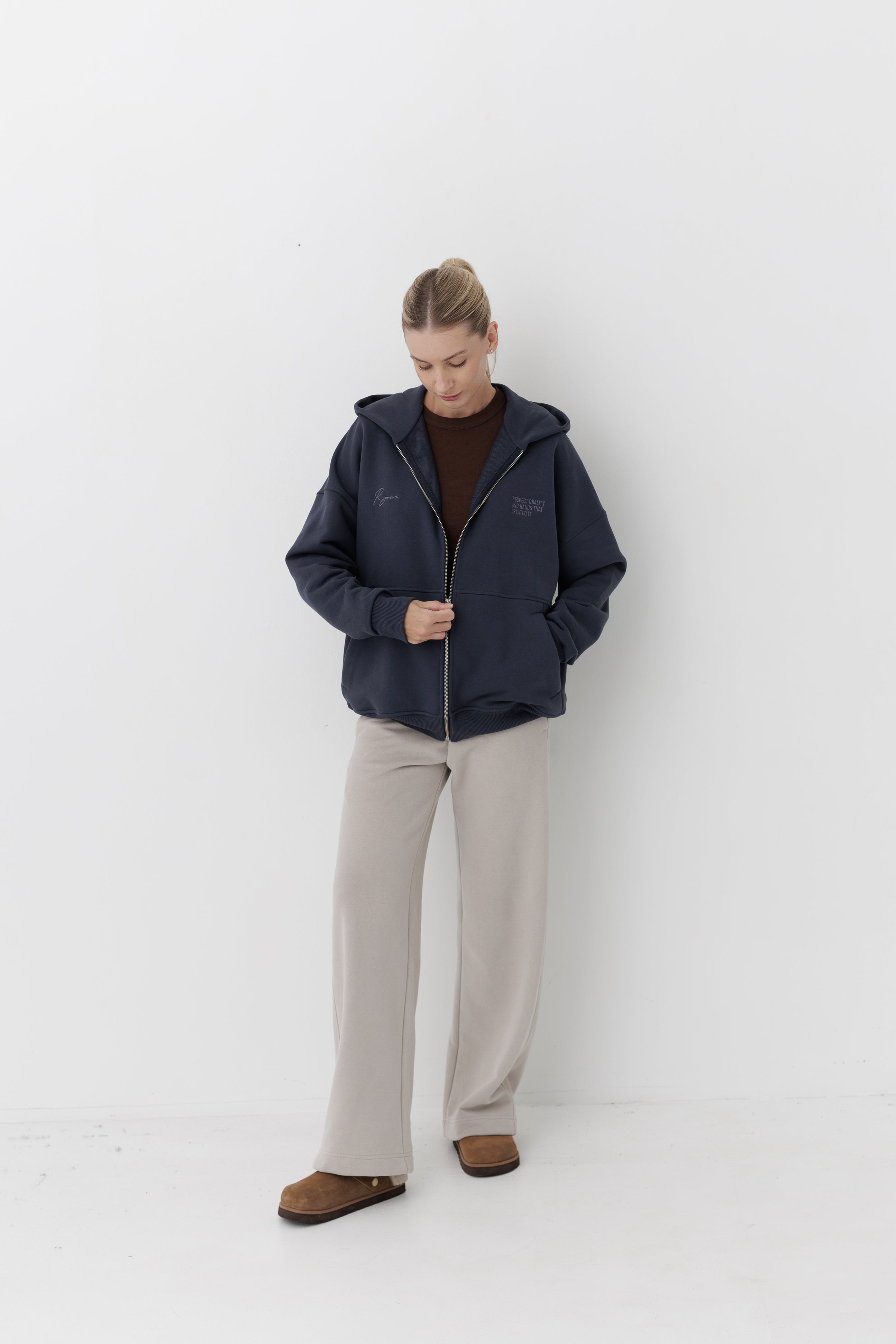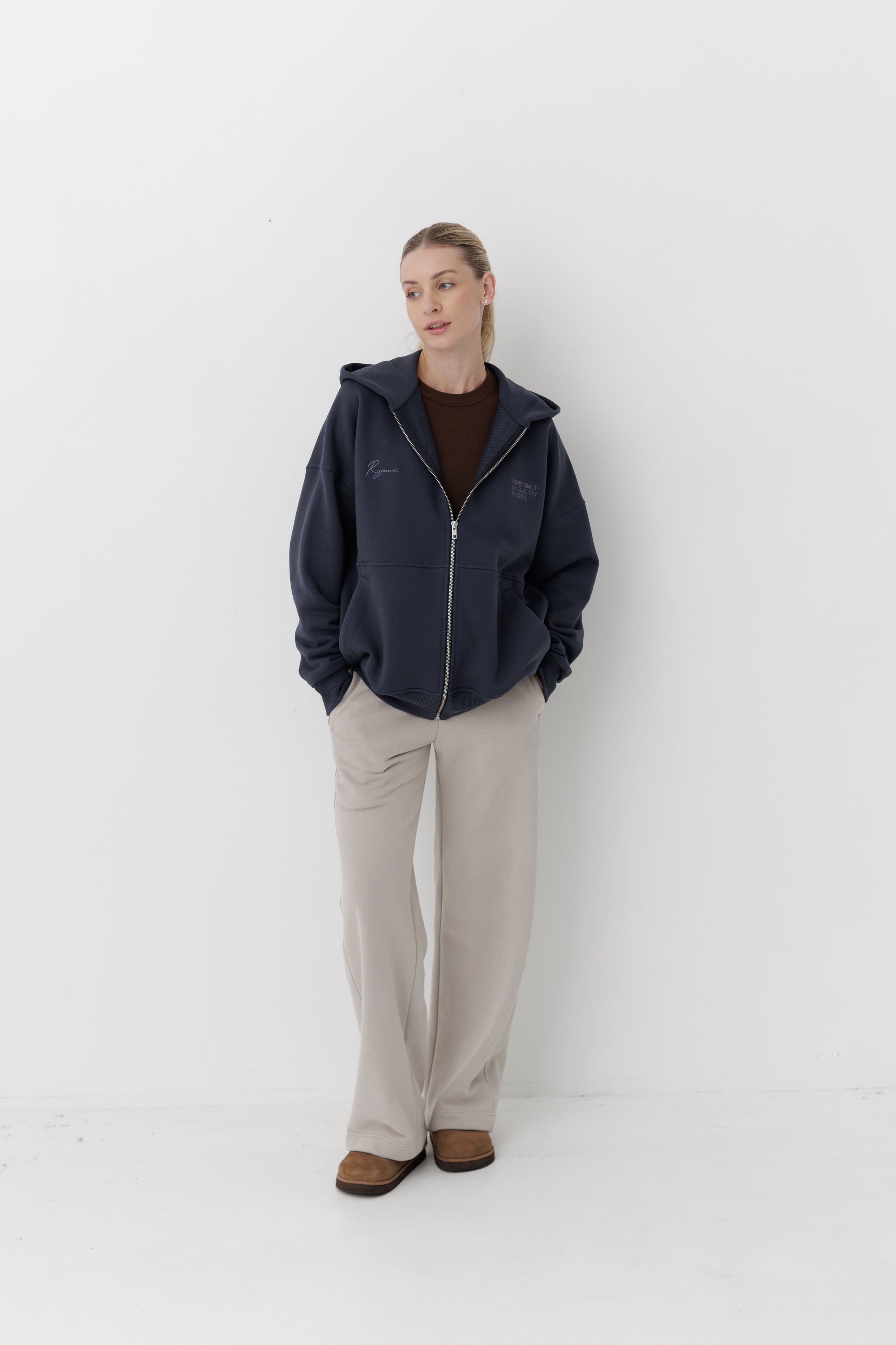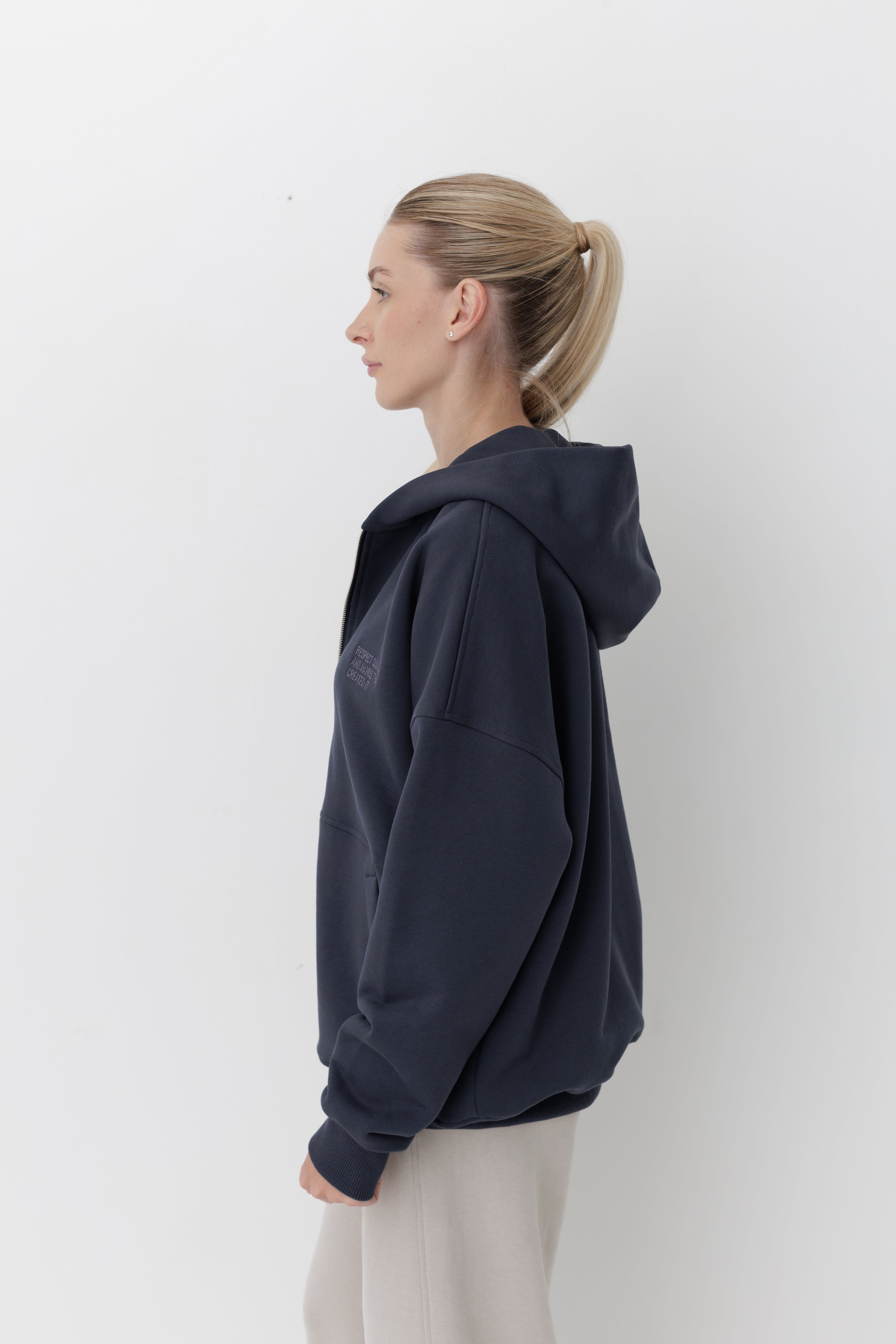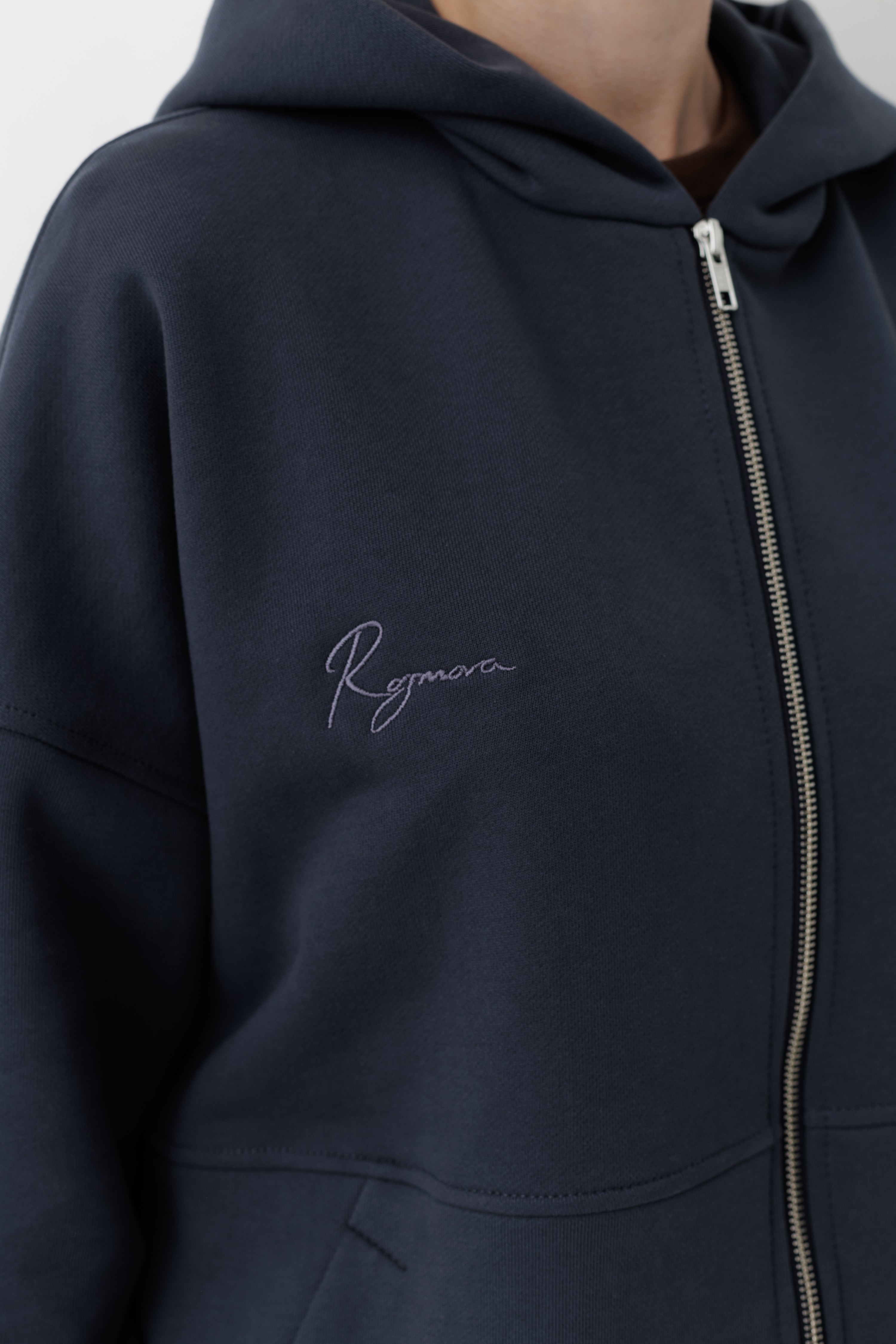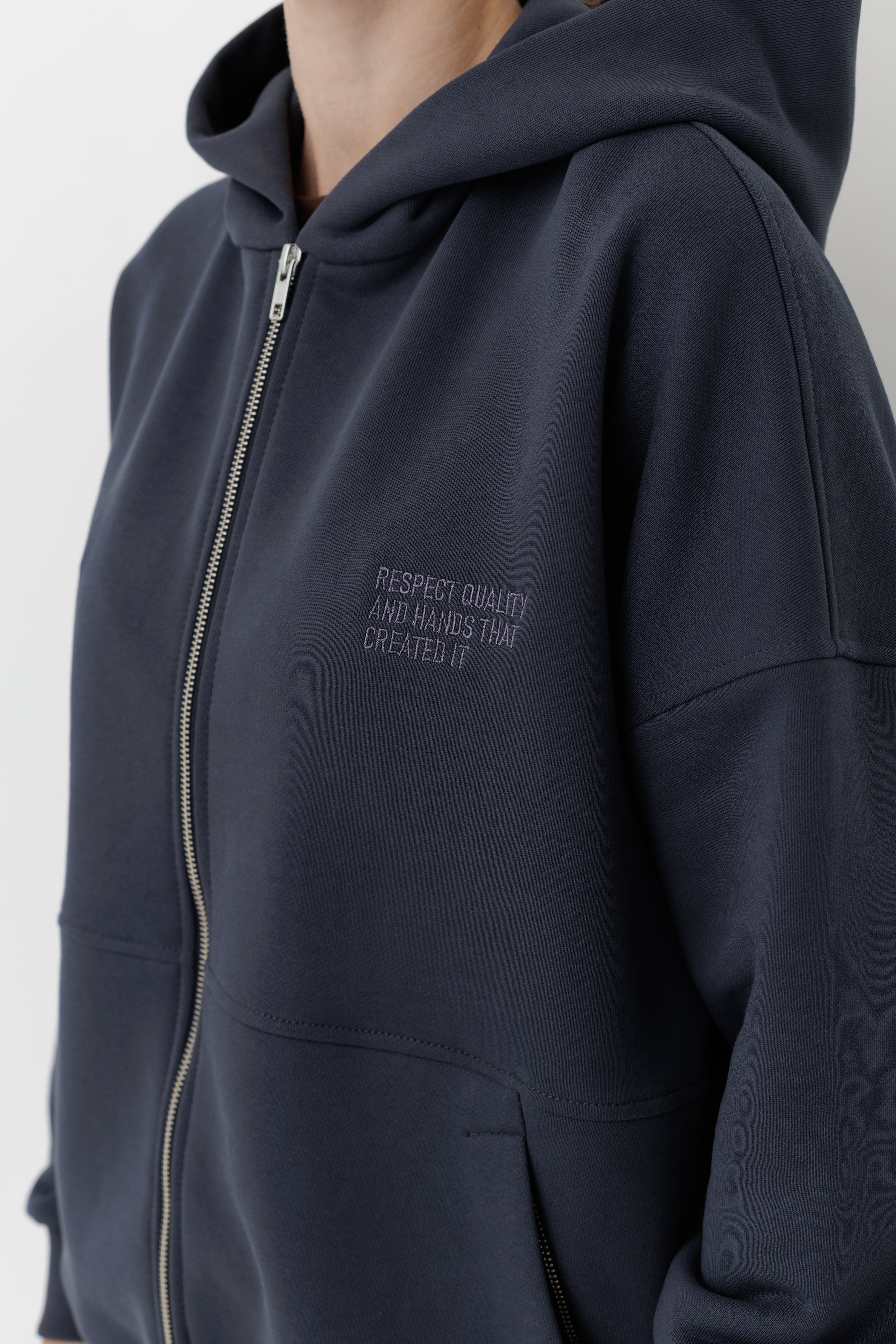 Худі має вишитий у тон логотип Rozmova та вишитий напис на грудях: «RESPECT QUALITY AND HANDS THAT CREATE IT».